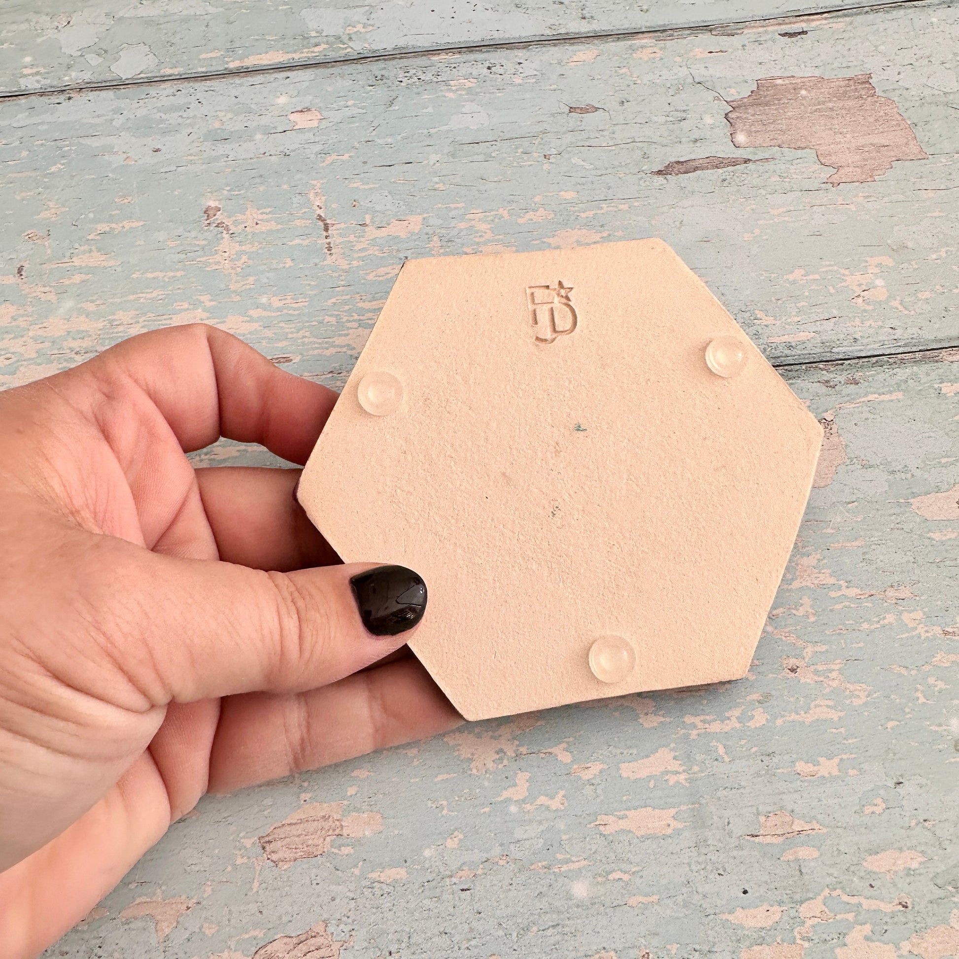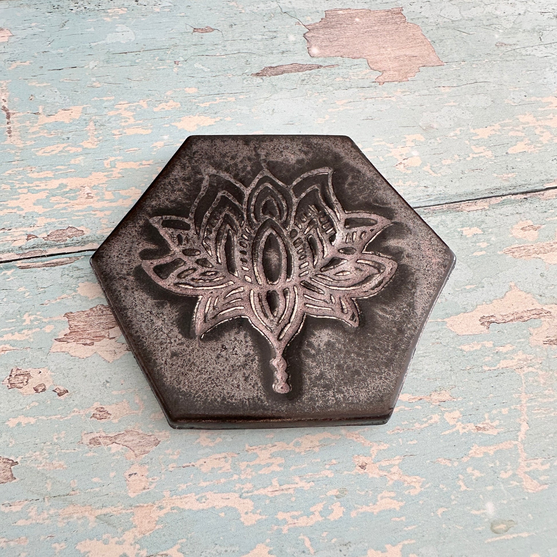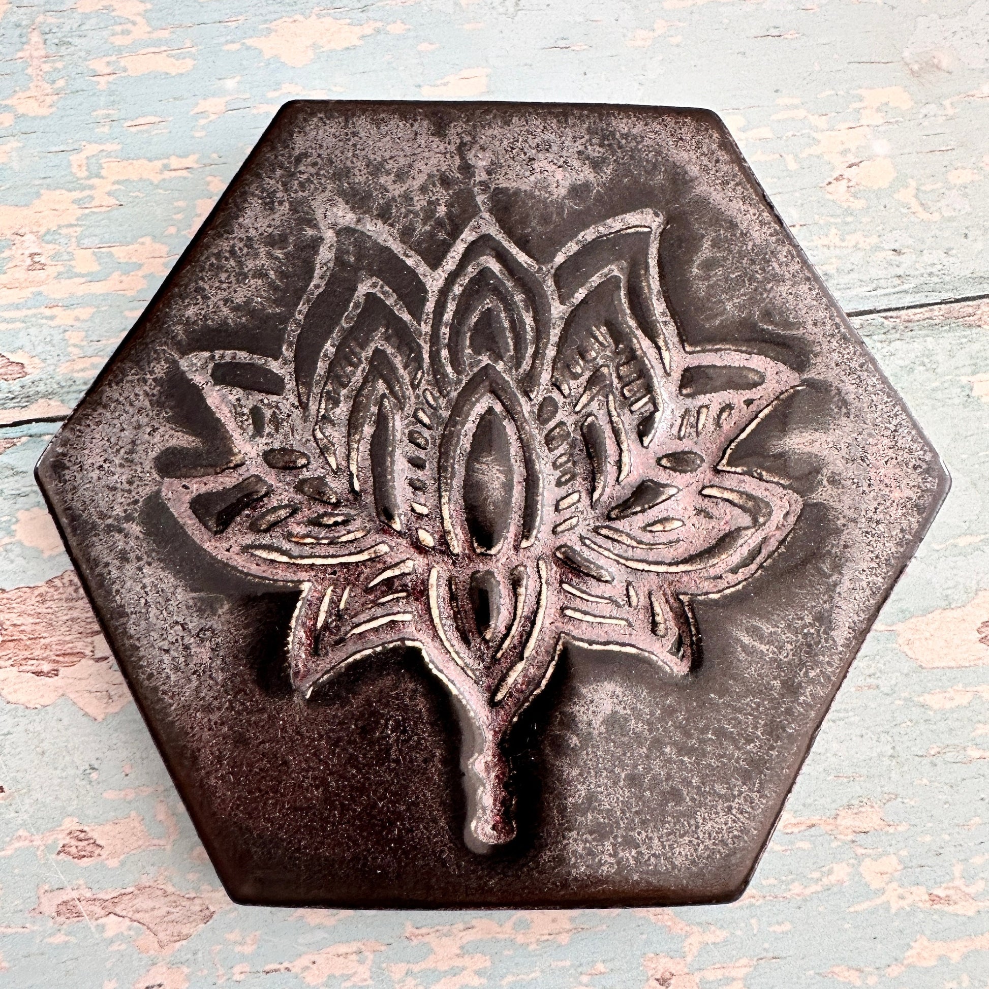 Beautiful Hexagon Ceramic Coasters with Lotus Flower imprint and black and sparkly silver Glaze.