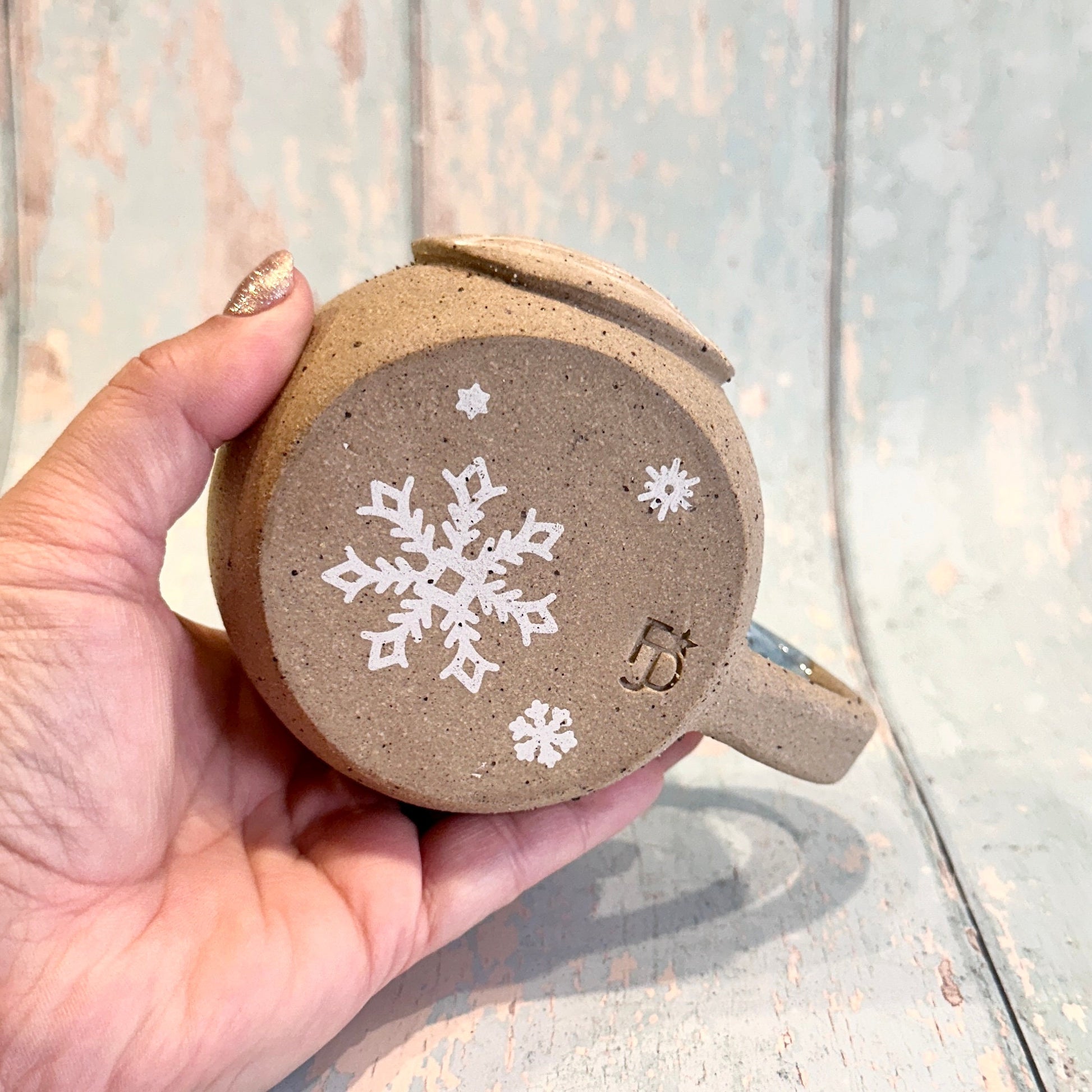 This one of a kind Christmas Snow Globe mug is made from lava fleck stoneware with white snow globe and a blue glaze, with a decorated bottom.
