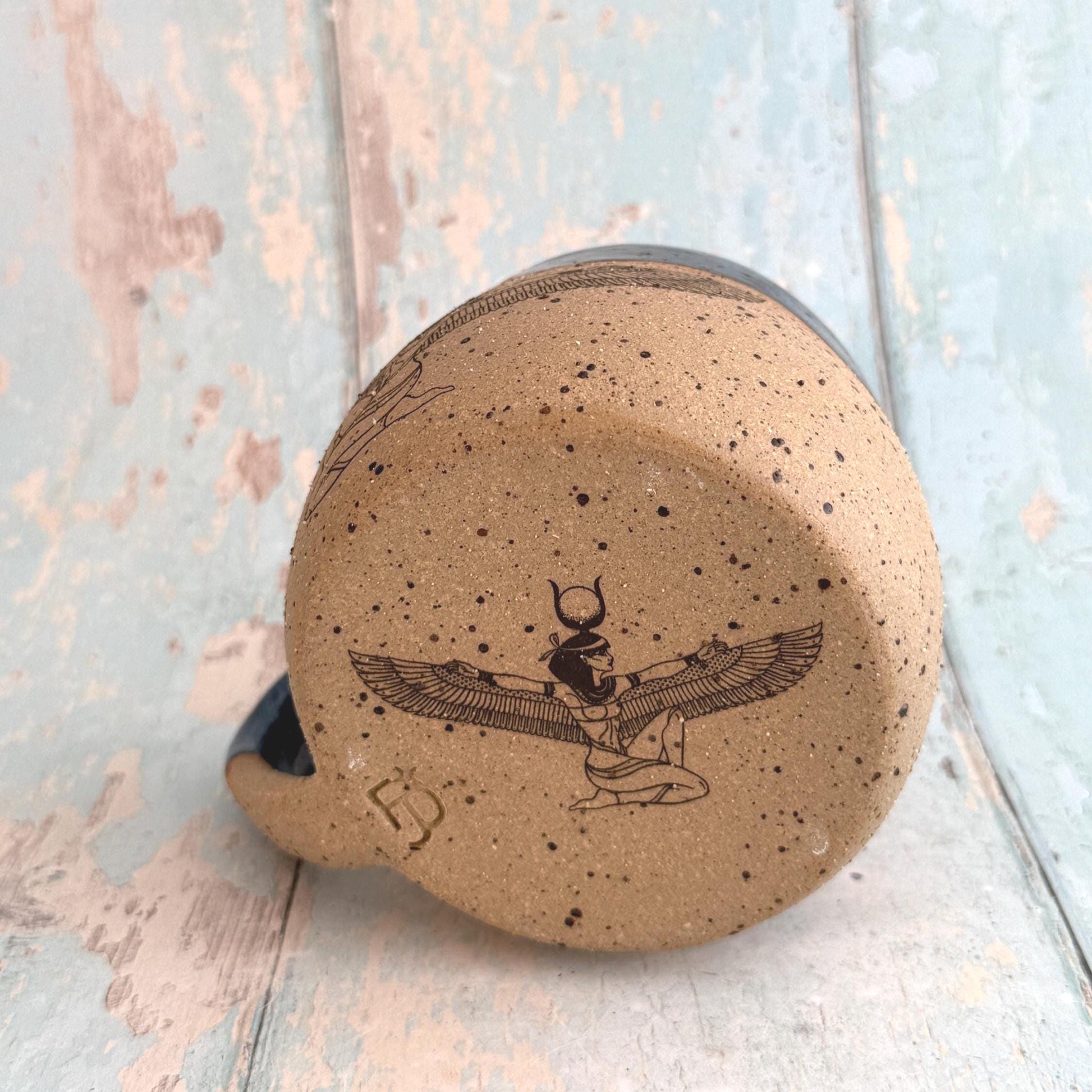 This large mug has a blue glaze and has black pictures of the Egyptian goddess Isis on it.