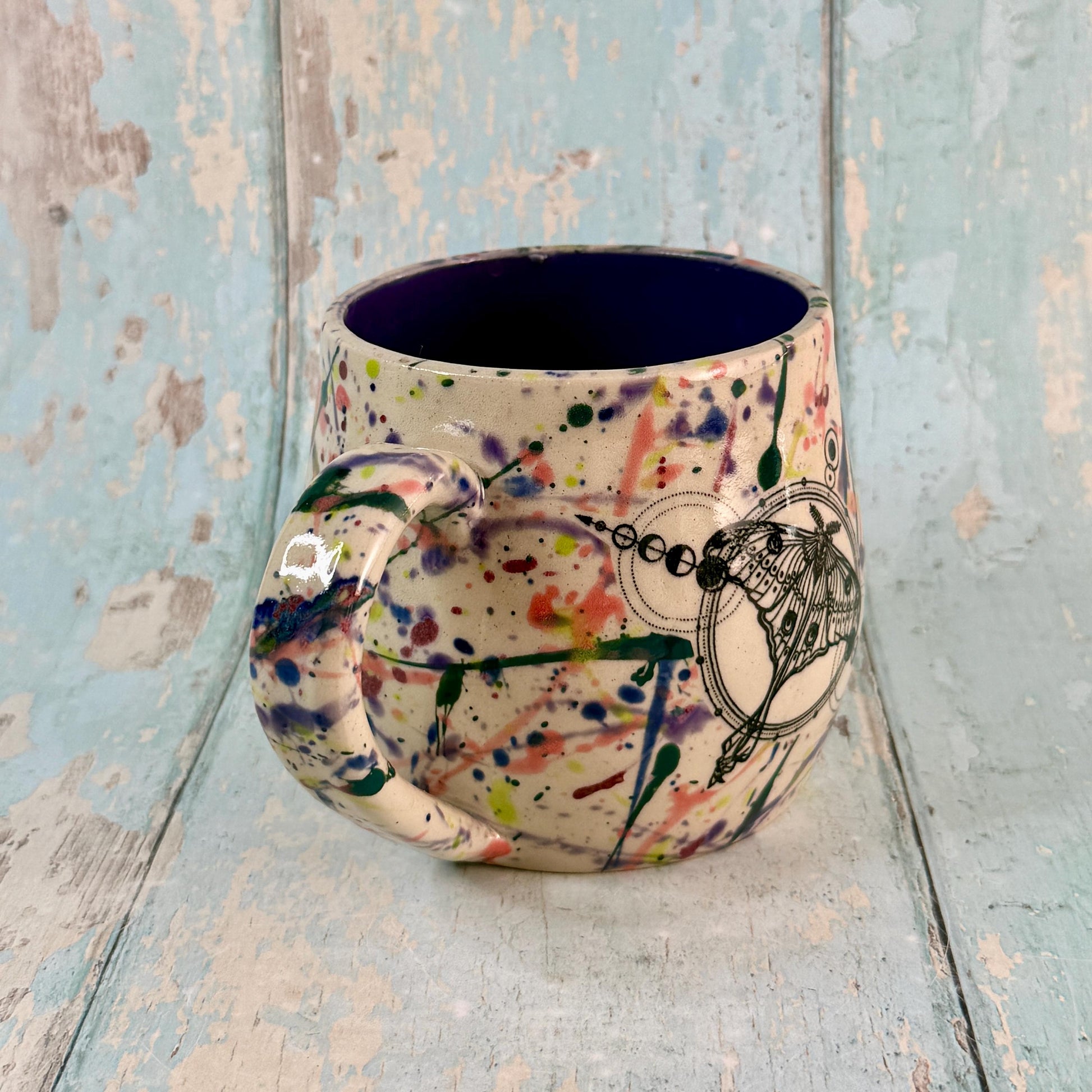 This mug has beautiful moth illustrations, with colourful splashes, and made from white stoneware clay.