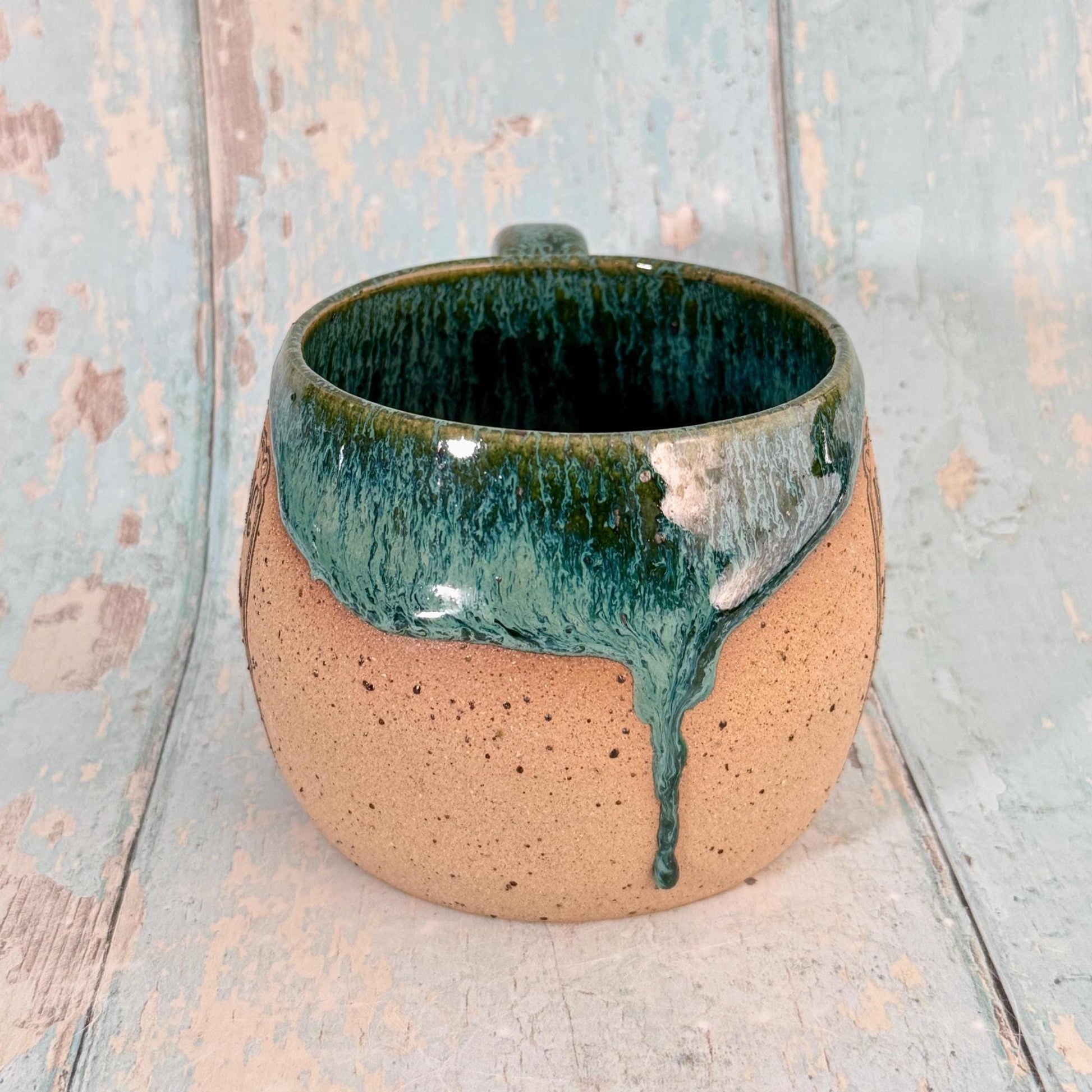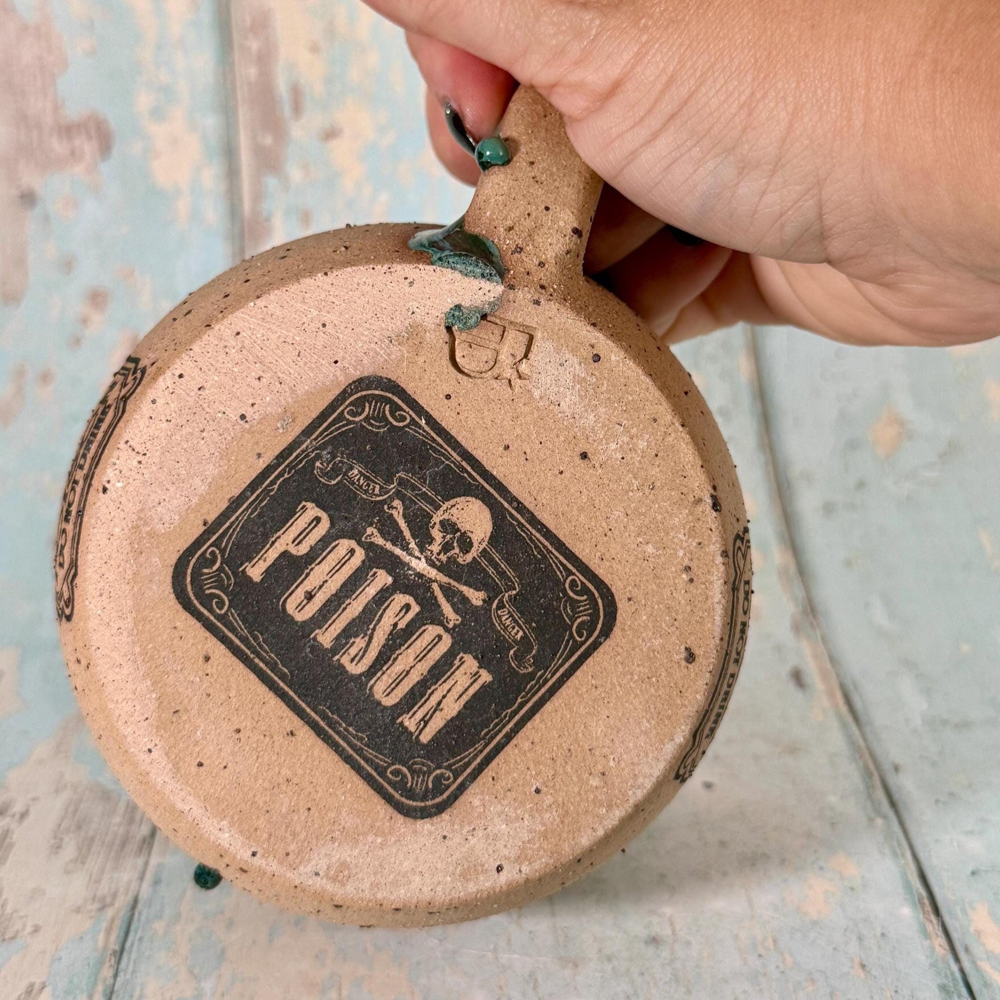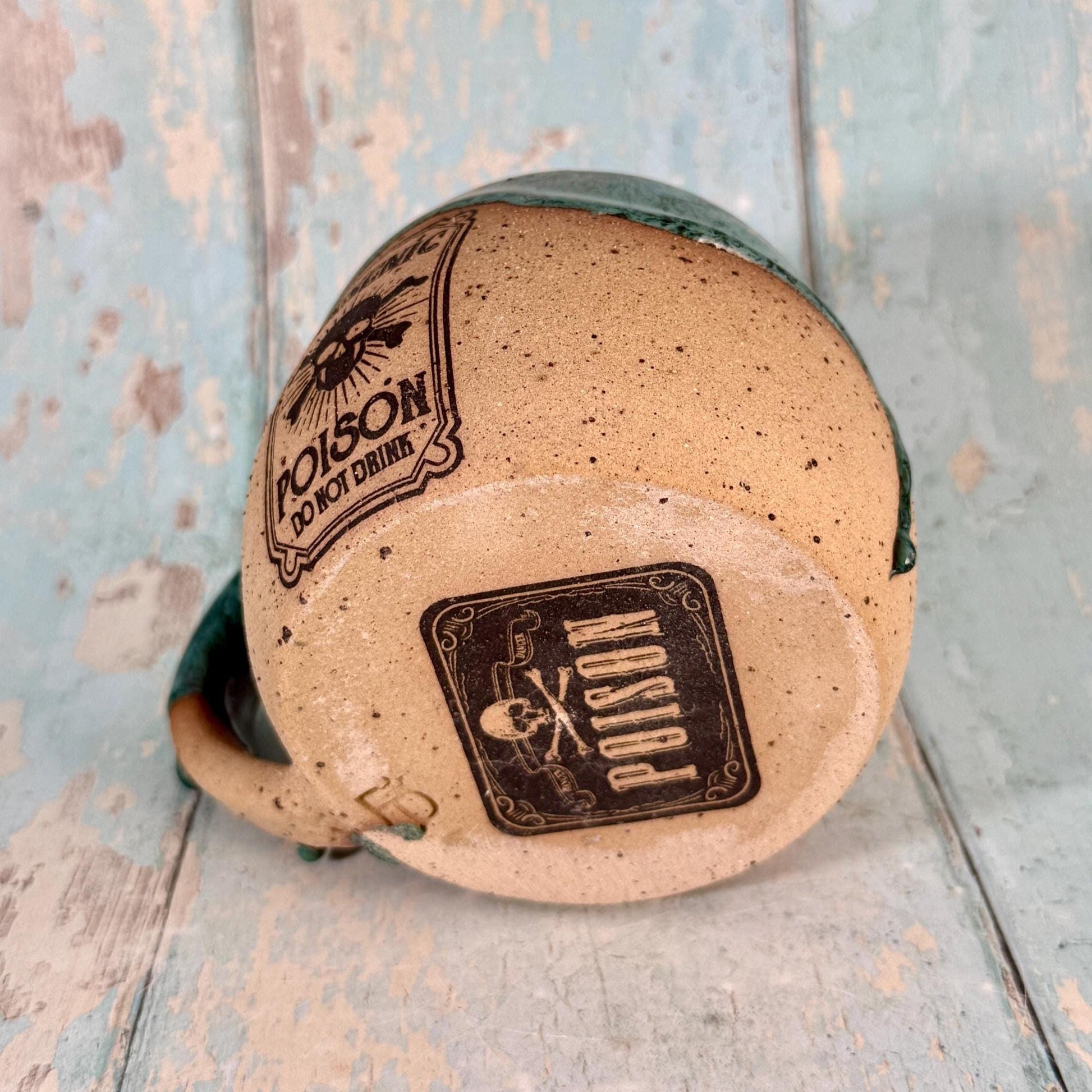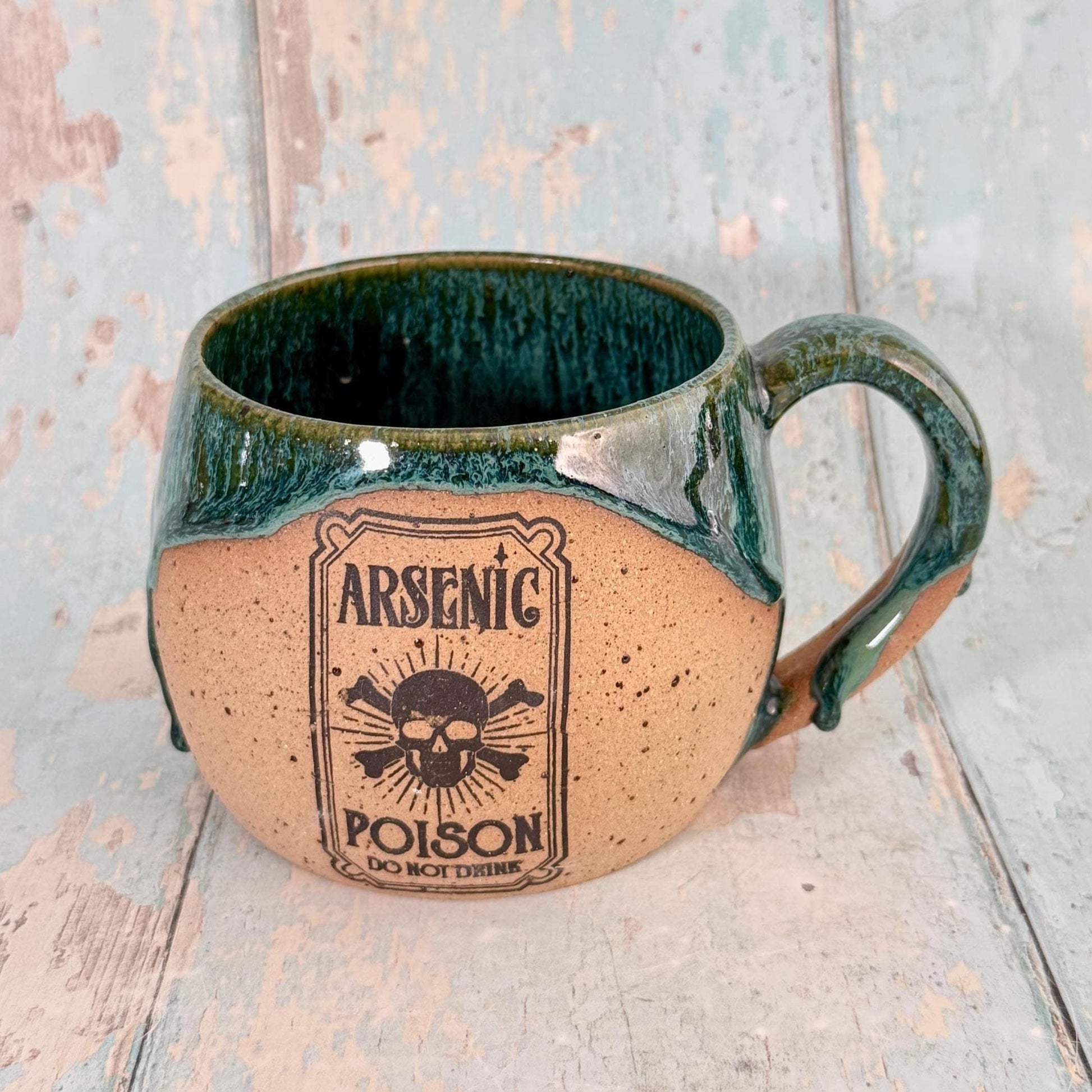 This mug is made from buff speckled stoneware clay and has Black Arsenic Poison label on it, with a green glaze. Perfect to drink or serve any type of poison you like, or simply have a cup of tea.