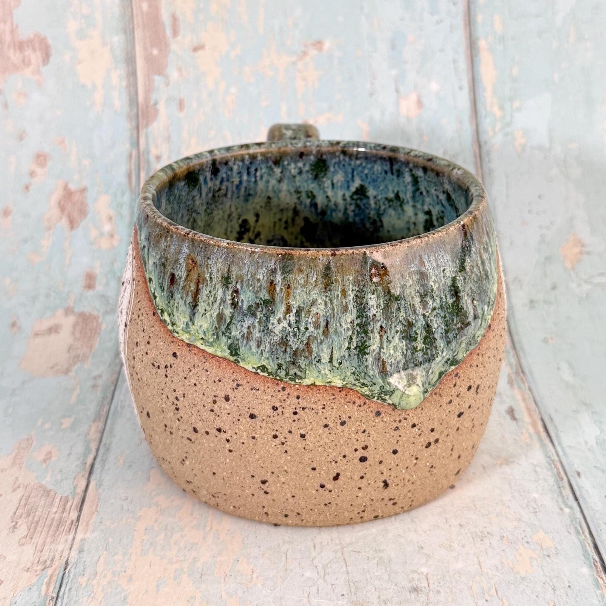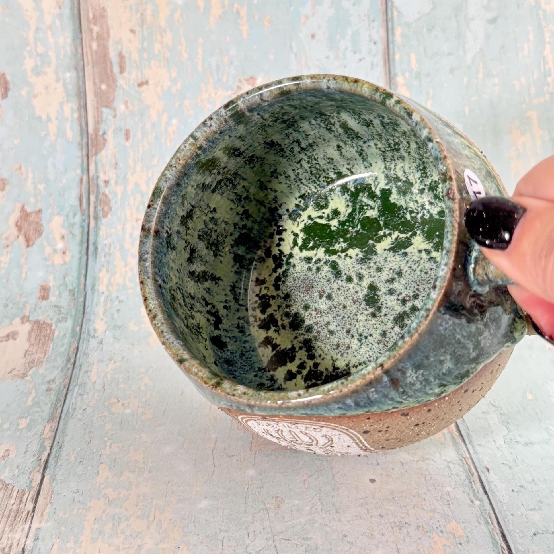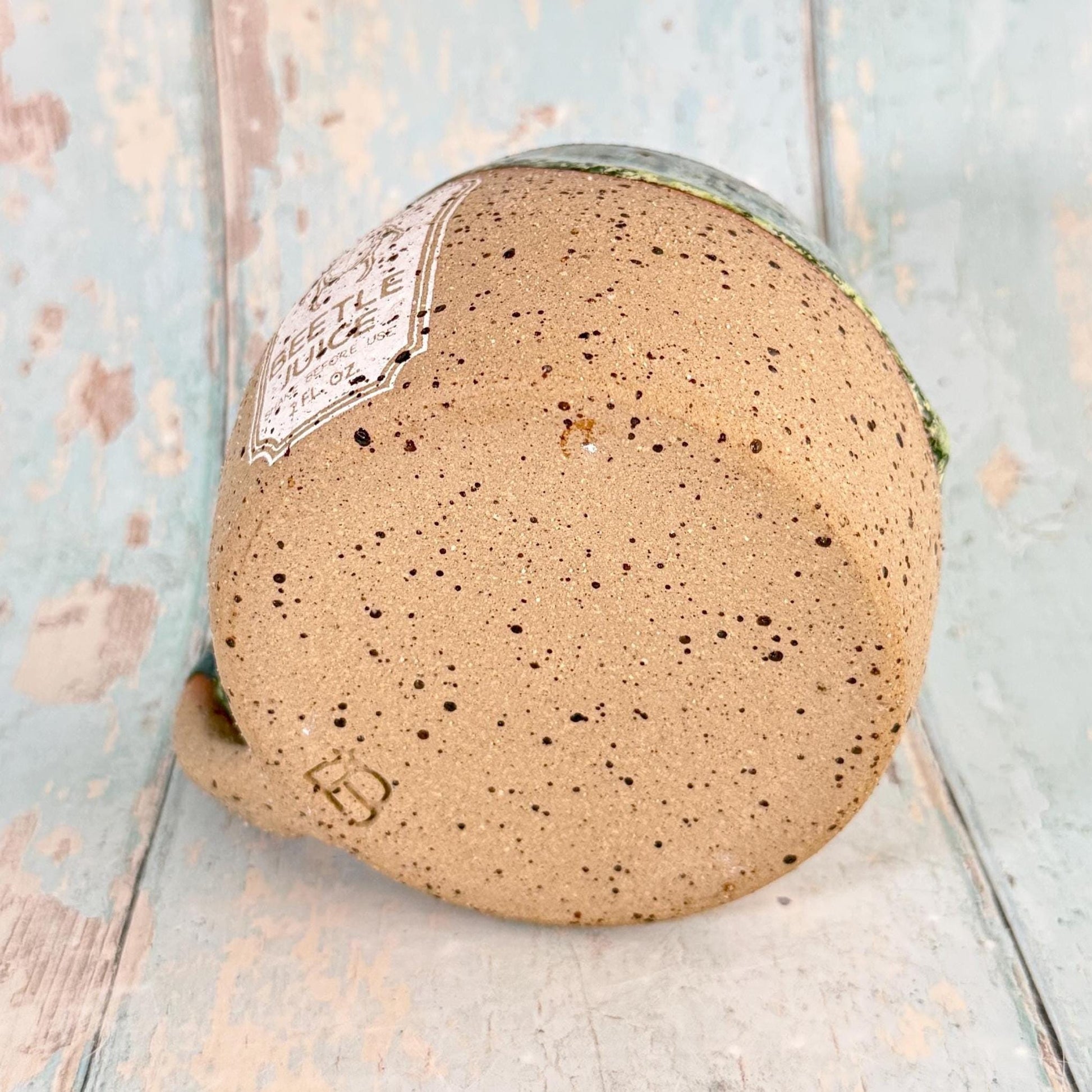 This mug is made from buff speckled stoneware clay and has a label saying "Beetle Juice" on it, with a green glaze. Perfect for all of your insect based juices or a cup of tea or coffee.