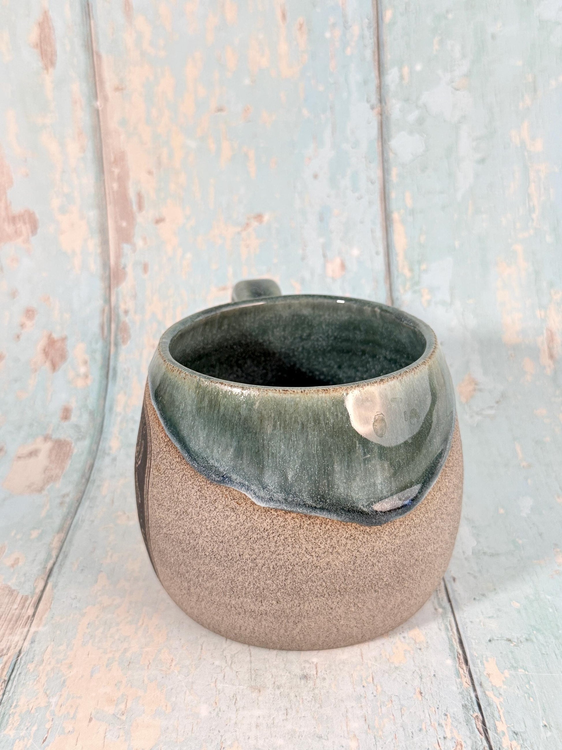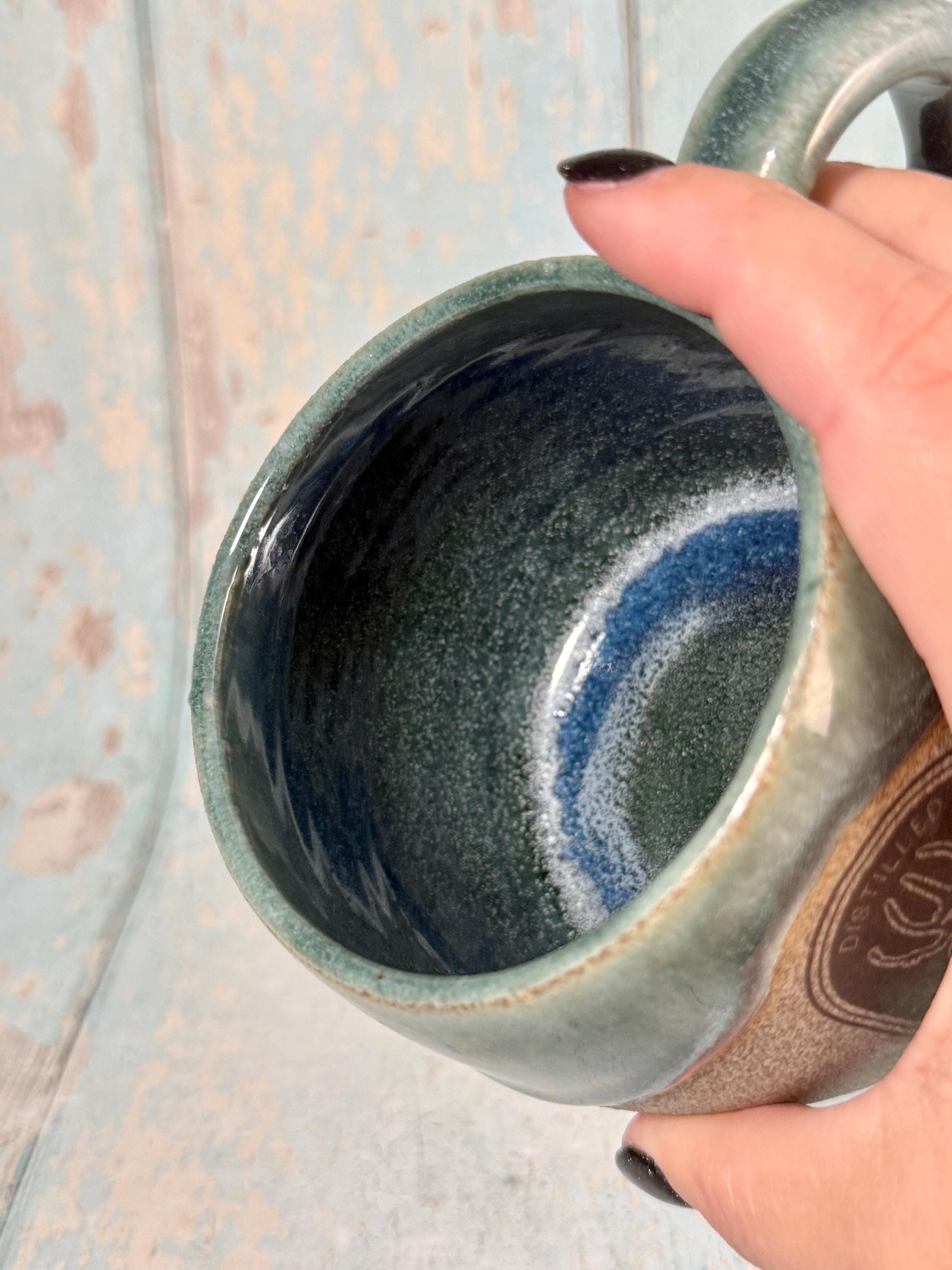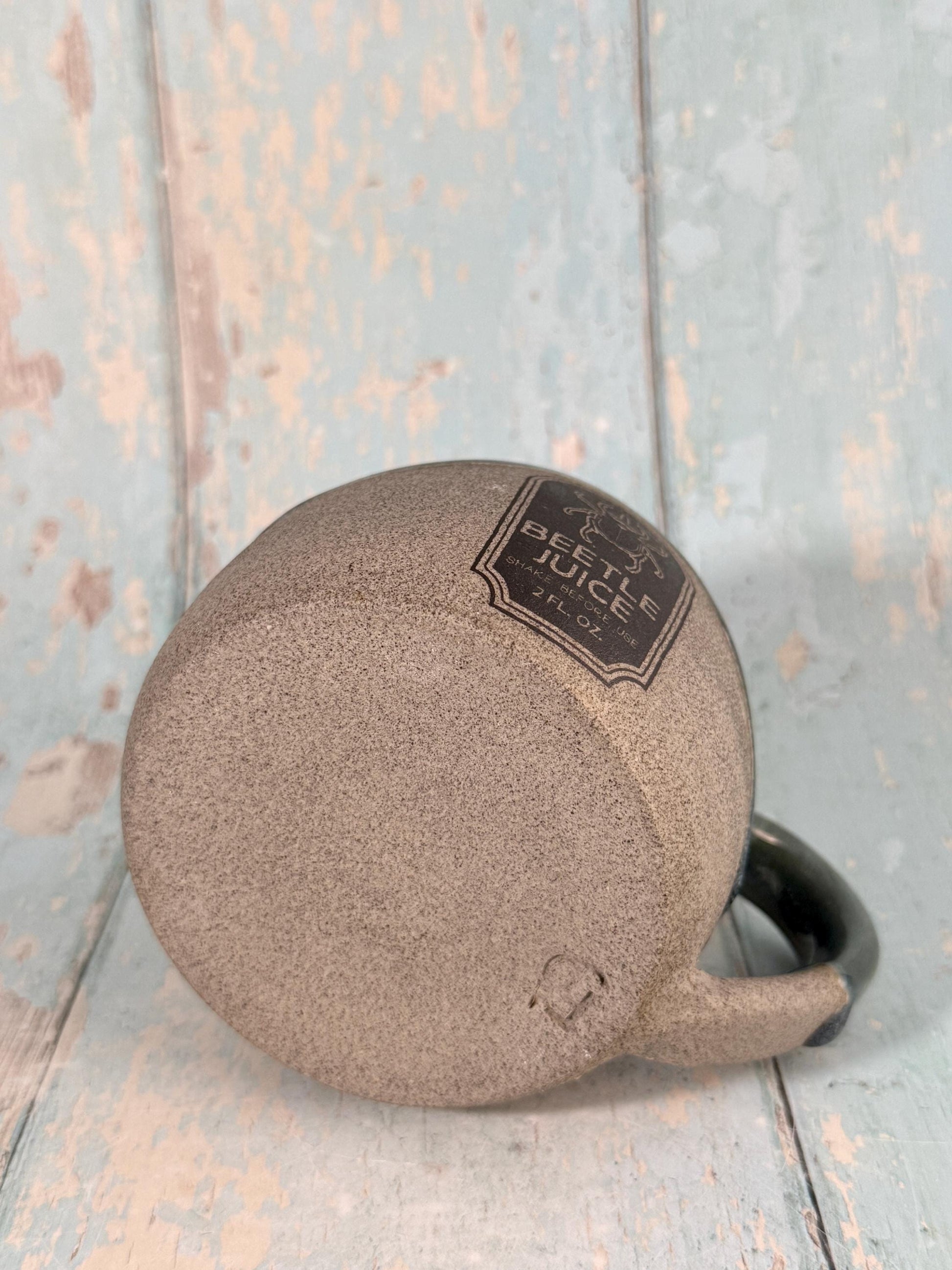 This mug is made from grey stoneware clay and has a label saying "Beetle Juice" on it, with a green glaze. Perfect for all of your insect based juices or a cup of tea or coffee.
