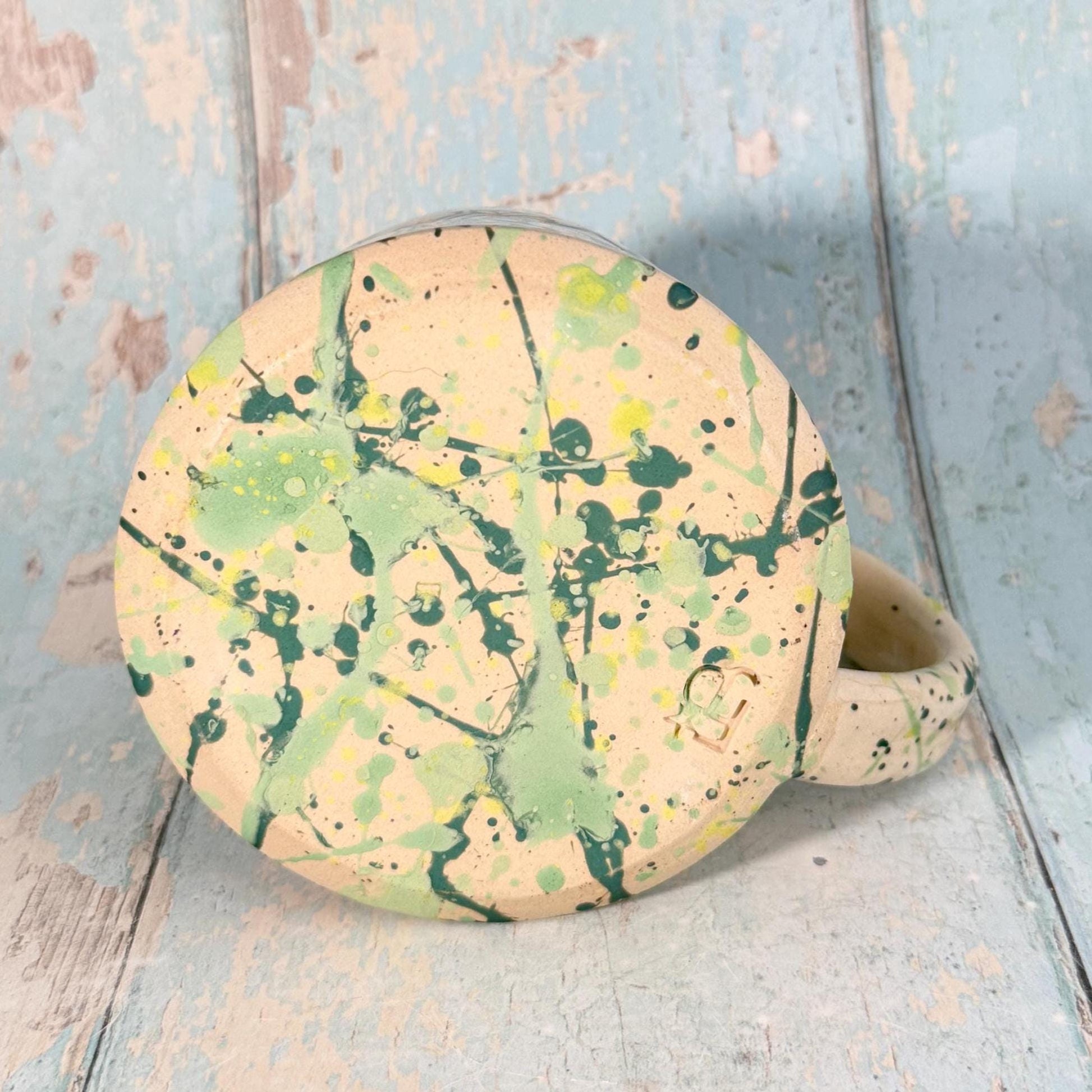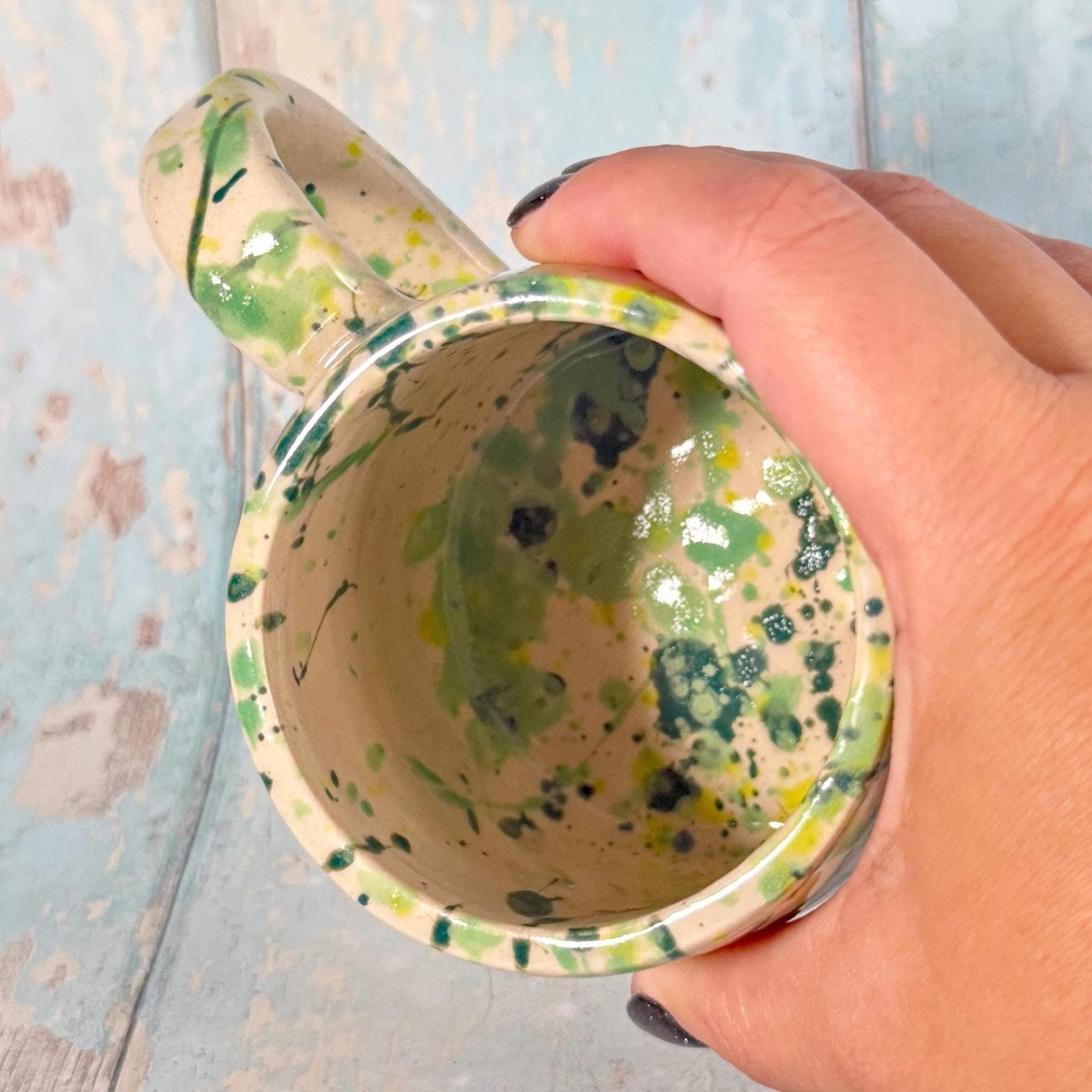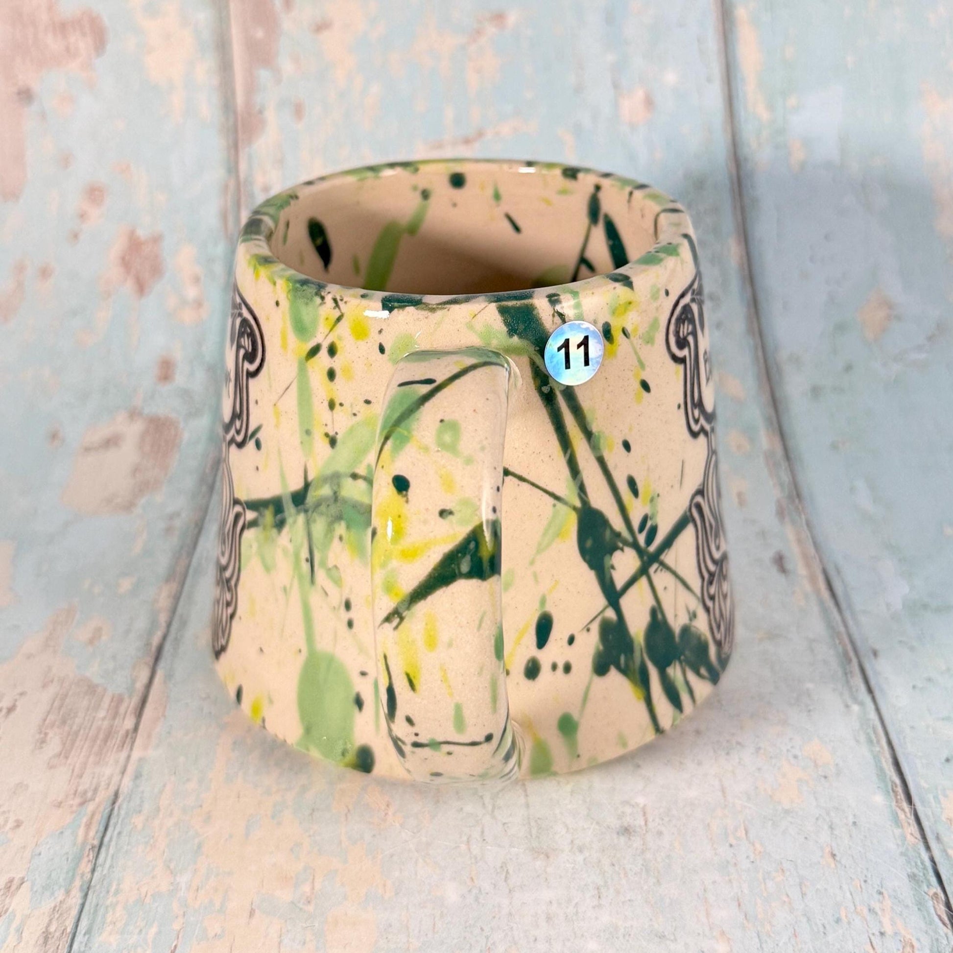 This mug is made from white stoneware clay and has a label saying "eye of newt" on it, with Green splatters.