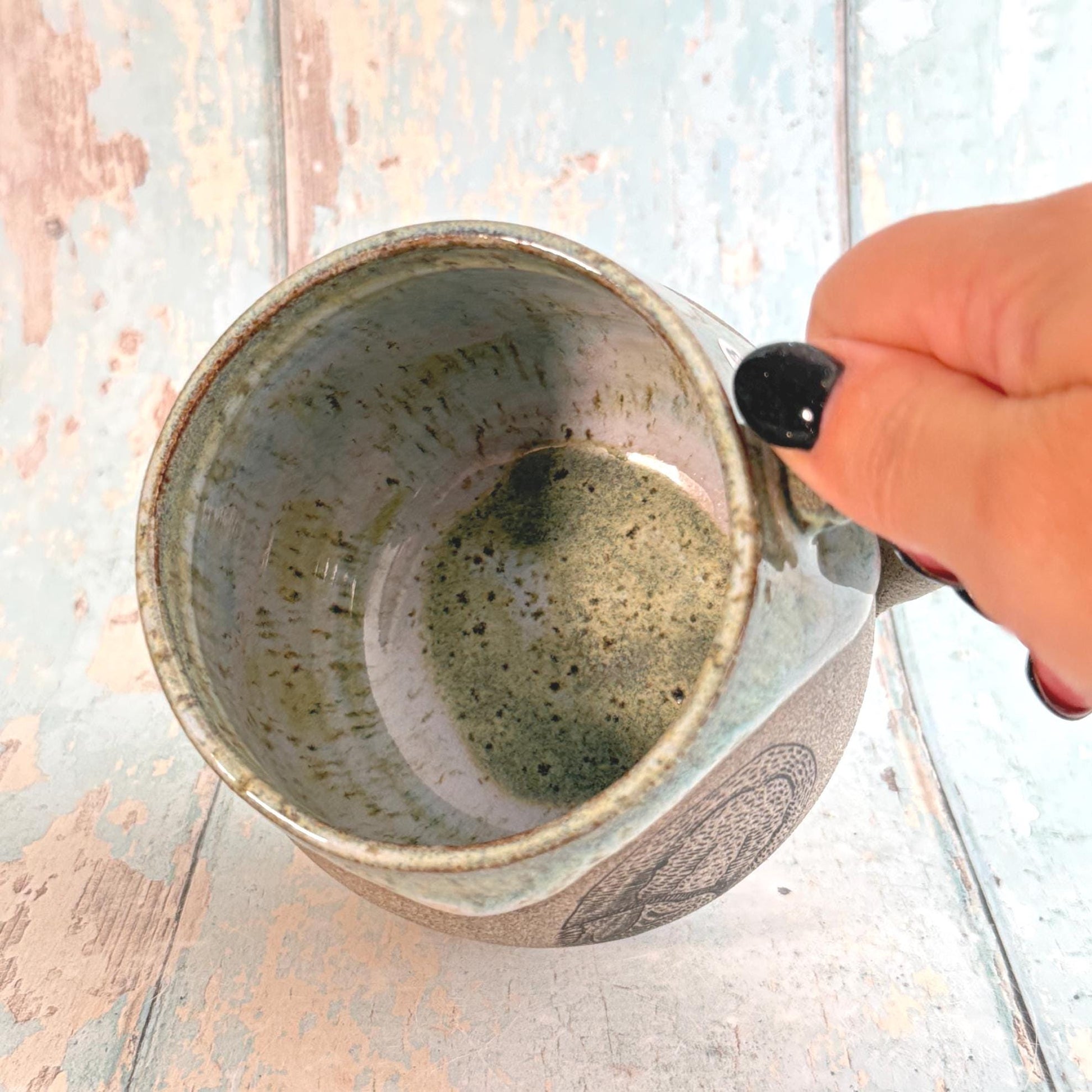 This large horseshoe crab mug has green glaze and has black crabs on raw clay.