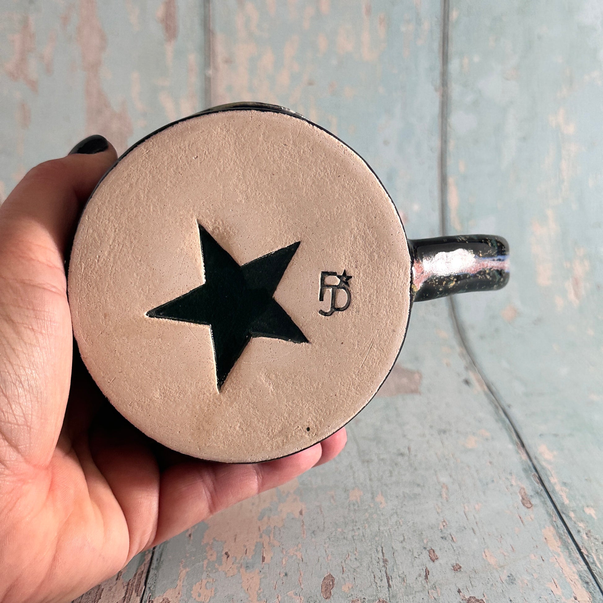 This large handmade ceramic green moon mug is has a green iridescent moon on a black background with green and yellow spot with a northern lights effect.