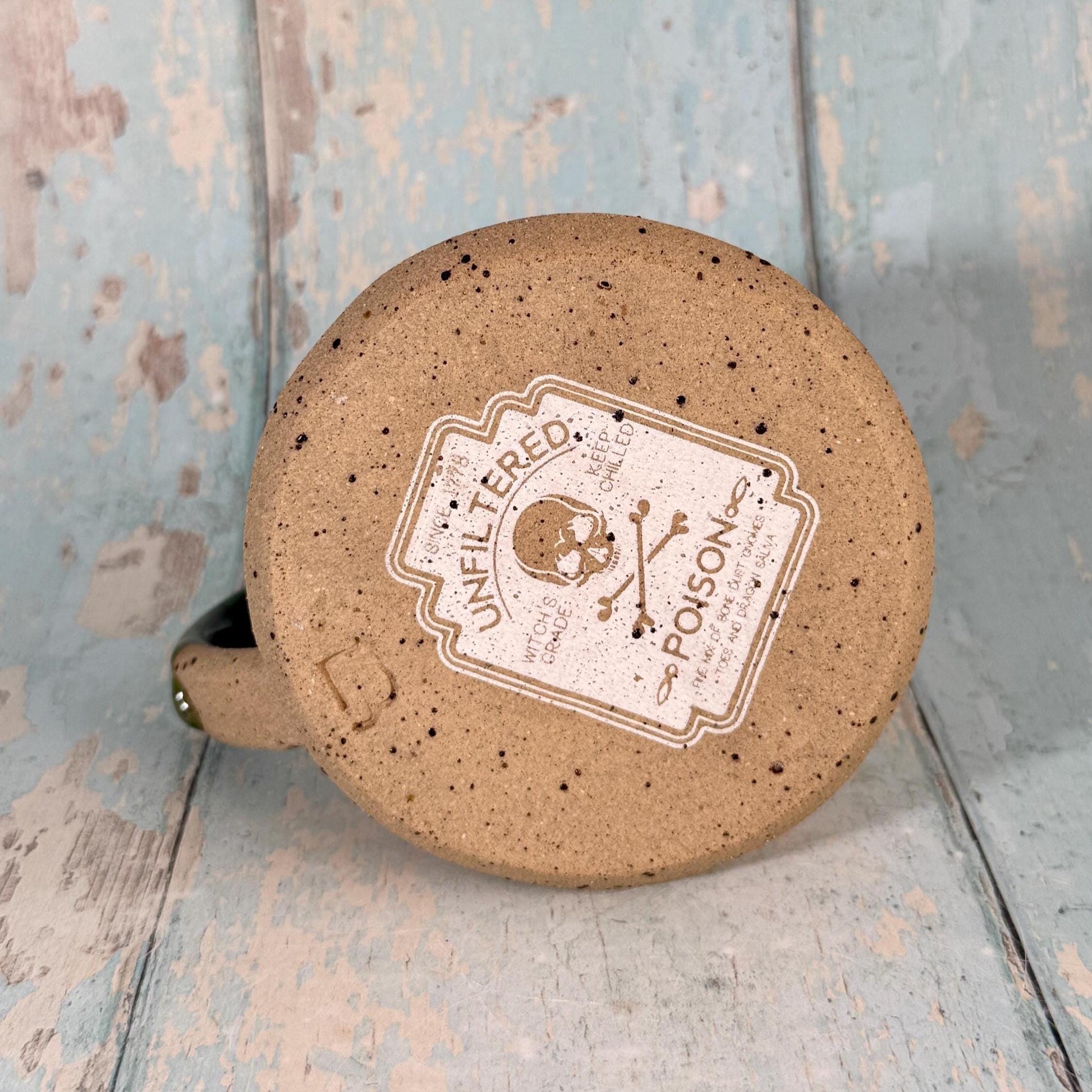 This mug is made from buff speckled stoneware clay and has a Poison label on it, with a green glaze. Perfect to drink or serve any type of poison you like, or simply have a cup of tea.