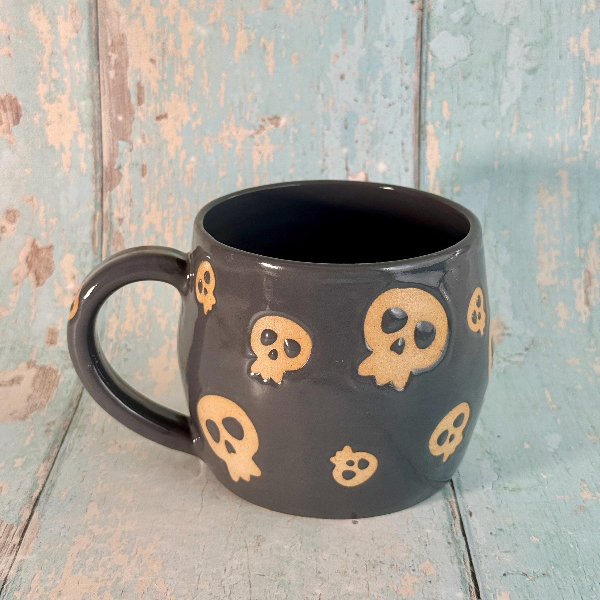 Grey Skull Mug, Handmade Ceramic Cup, Spooky Halloween Mug
