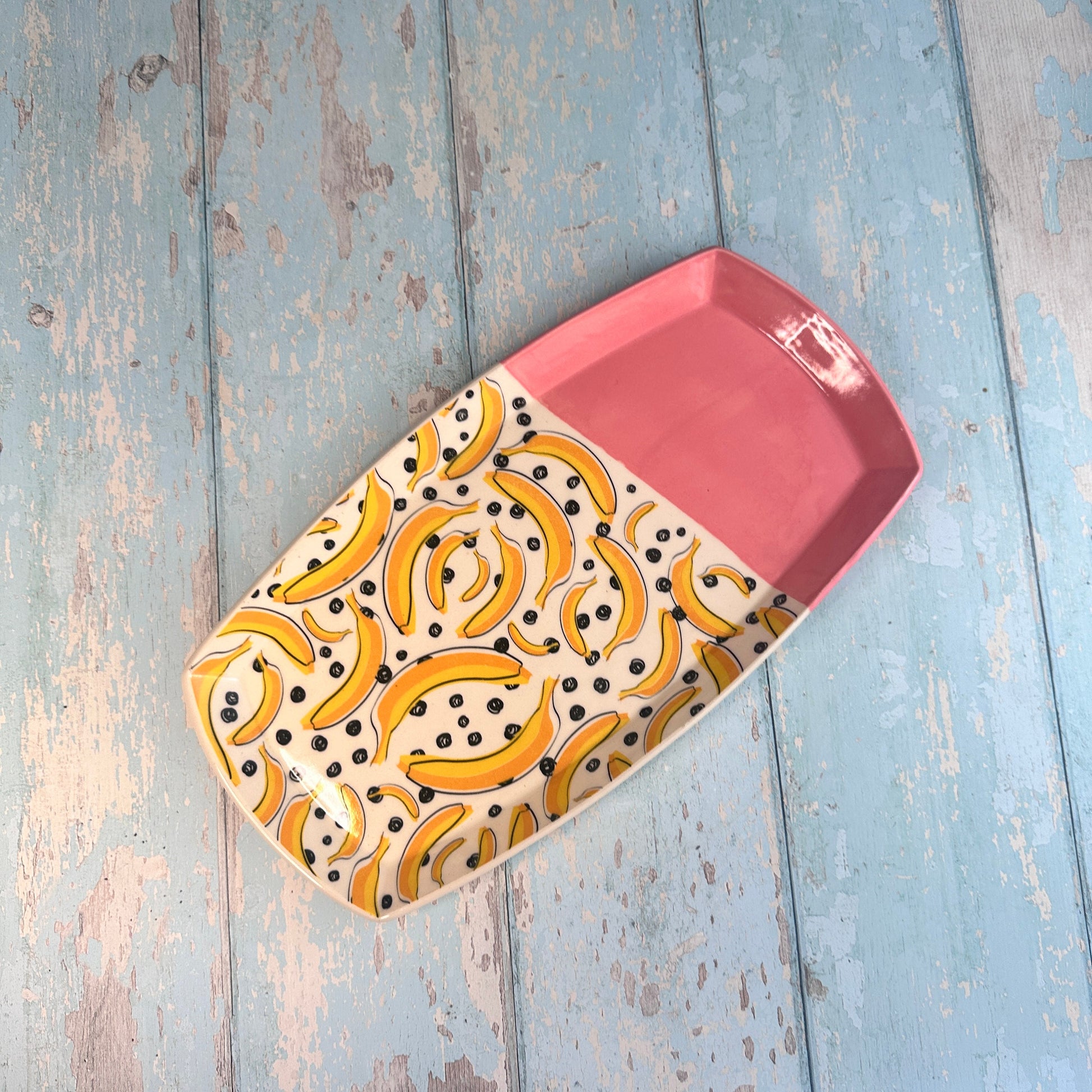 Large Banana Platter, Yellow and Pink Handmade Rectangle Ceramic Plate