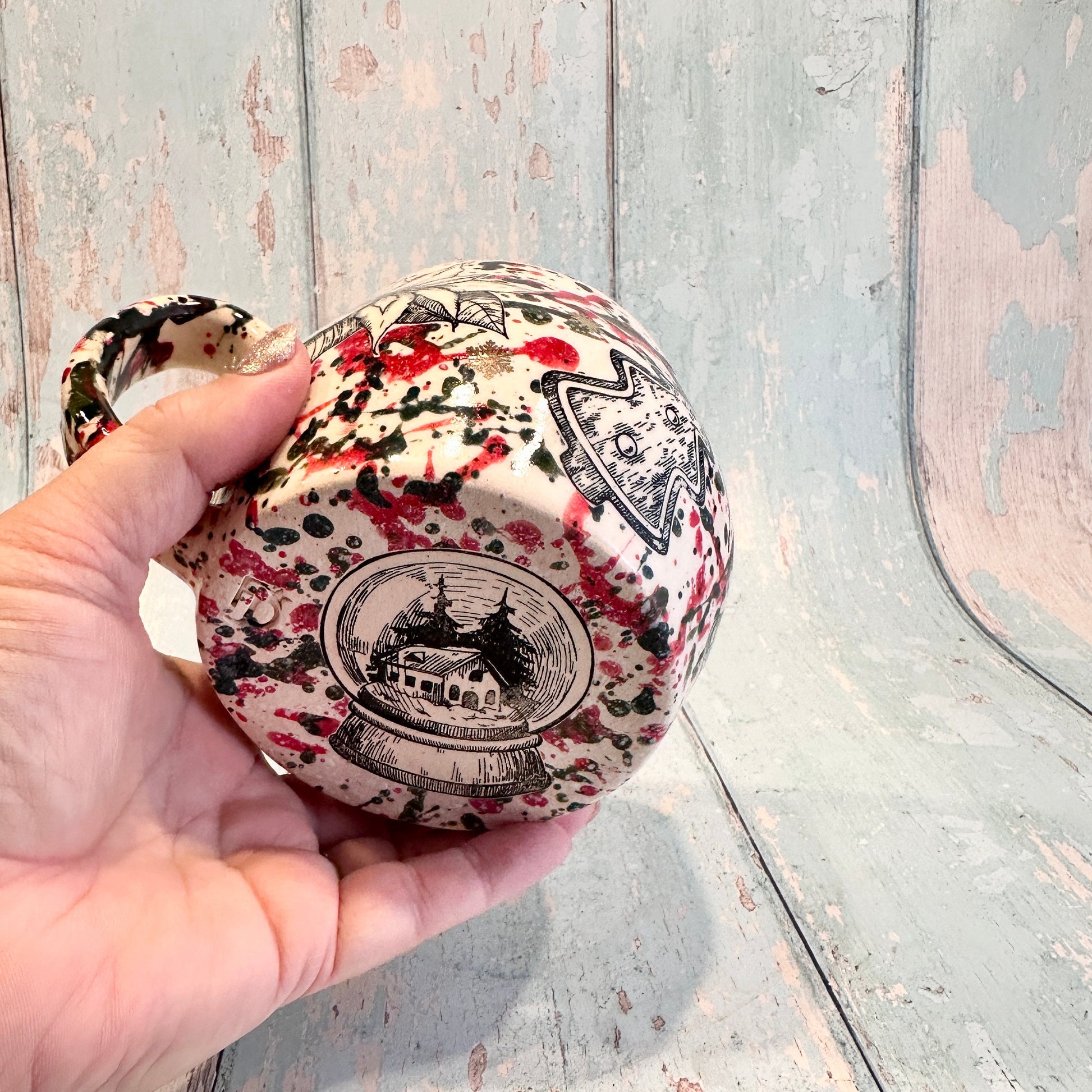 This one of a kind Christmas mug is made from white stoneware with black illustrations, and green and red splashes, and real gold snowflakes.