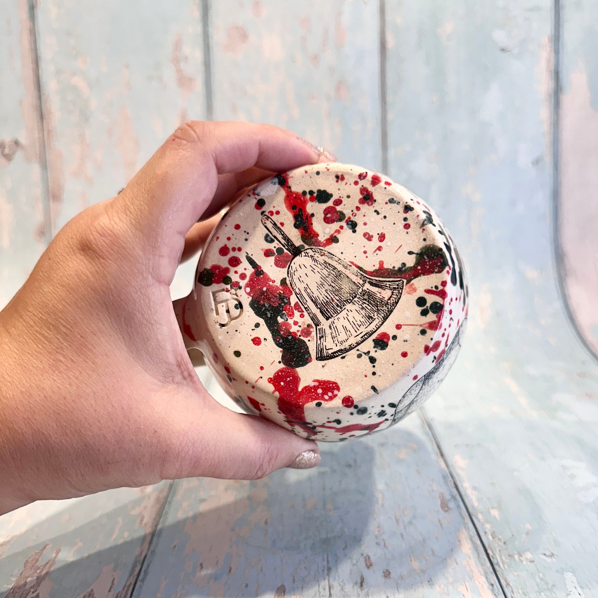This one of a kind Christmas mug is made from white stoneware with black illustrations, and green and red splashes, and real gold snowflakes.