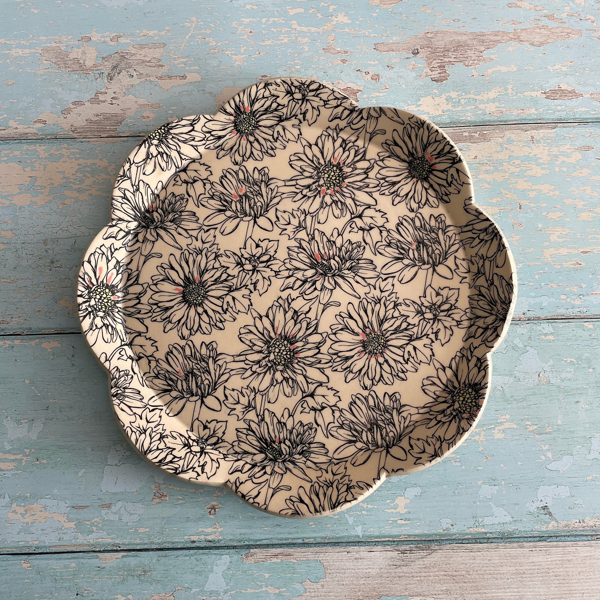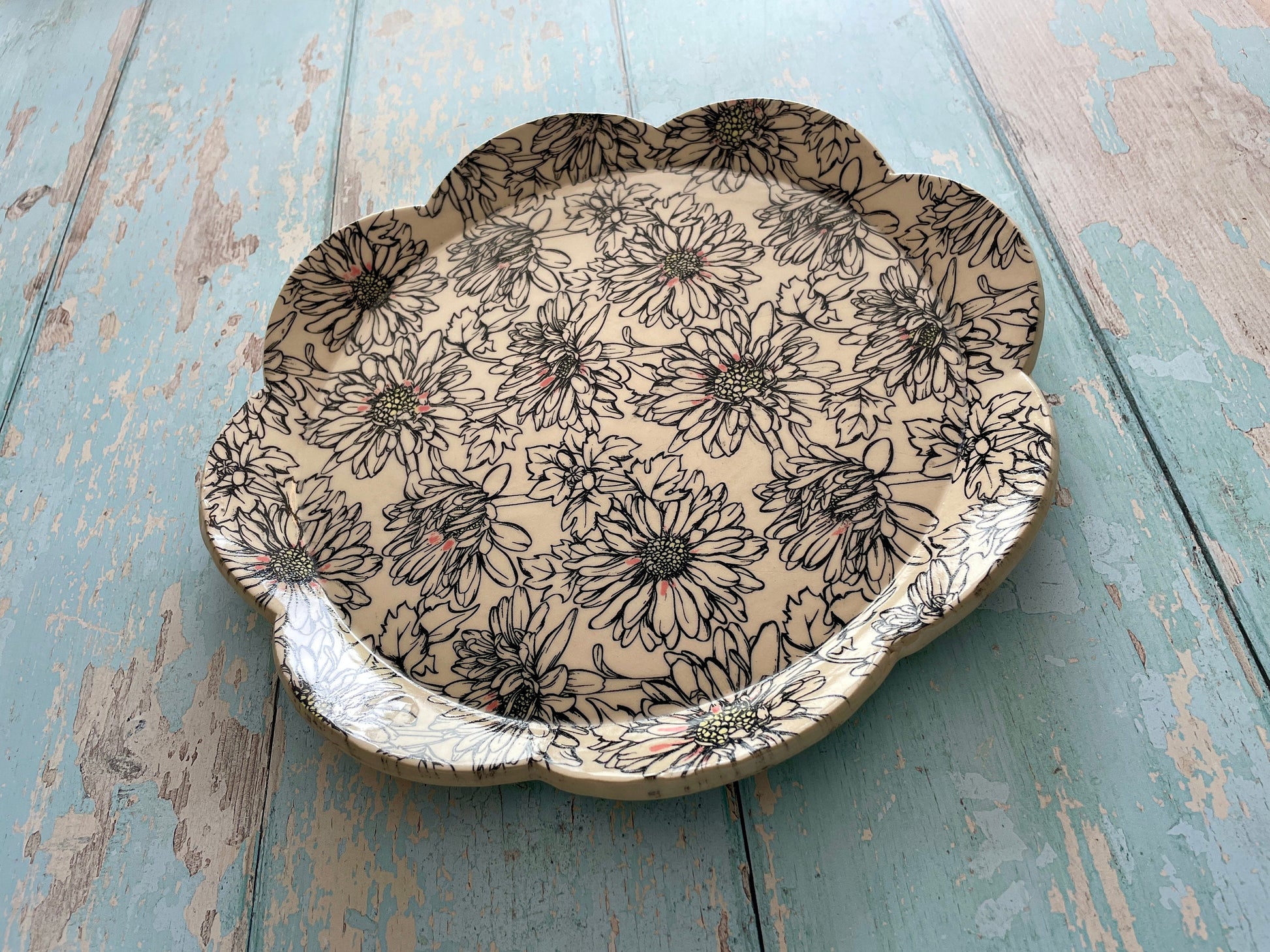 A unique one of a kind large platter or plate that has a Daisy print with yellow and pink detail, in a daisy shape.