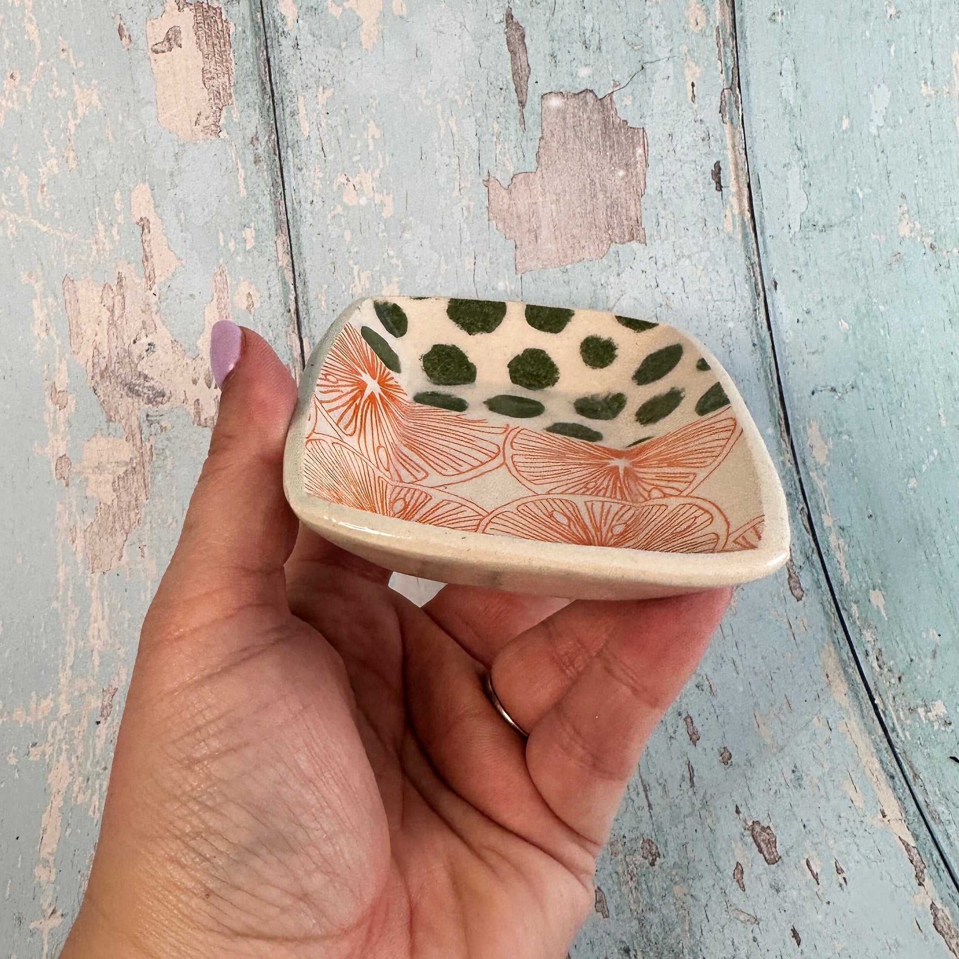 Orange and Green Jewellery Dish, Handmade Hexagon Ceramic Pot