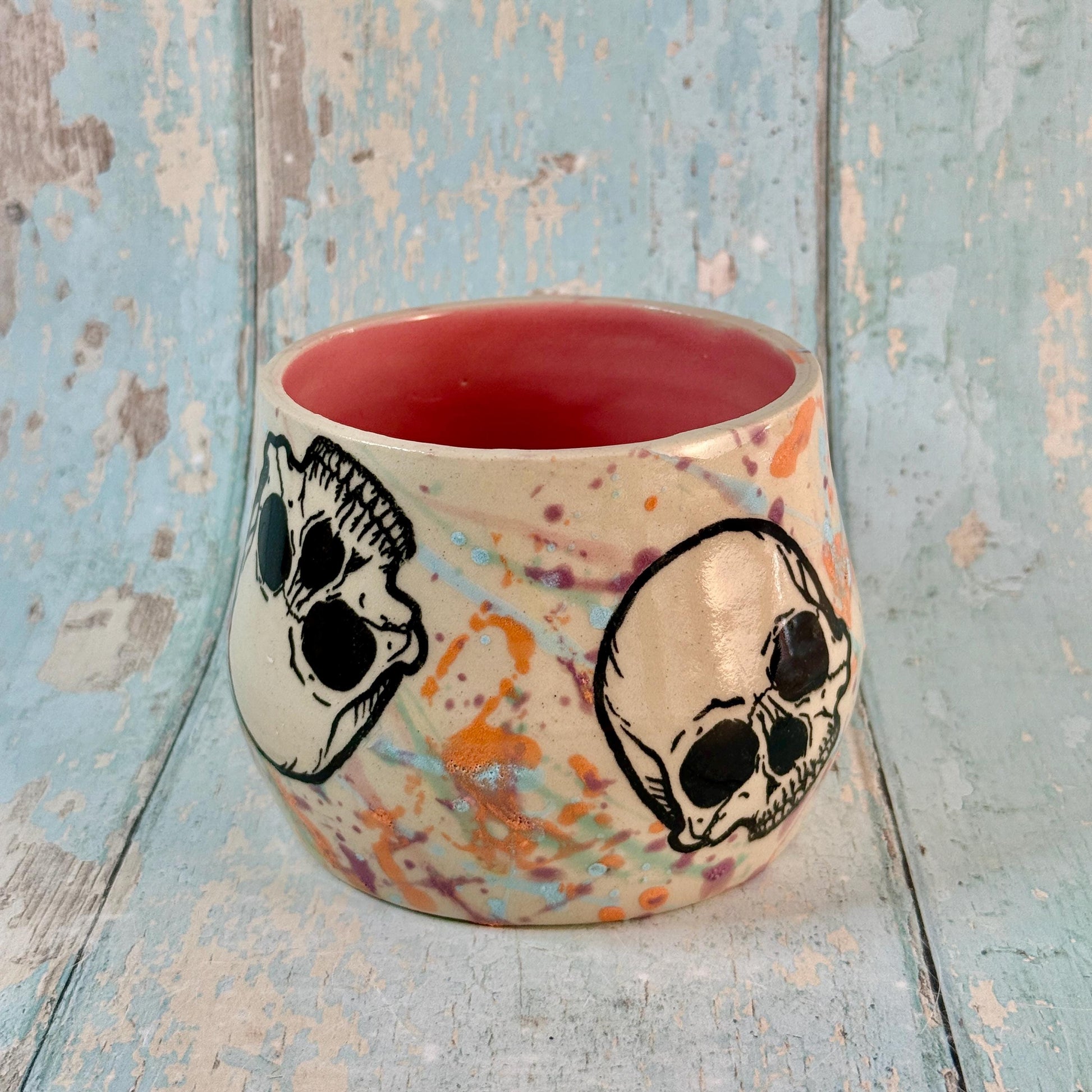 This mug is covered in skulls, with pastel splashes, and made from white stoneware clay.
