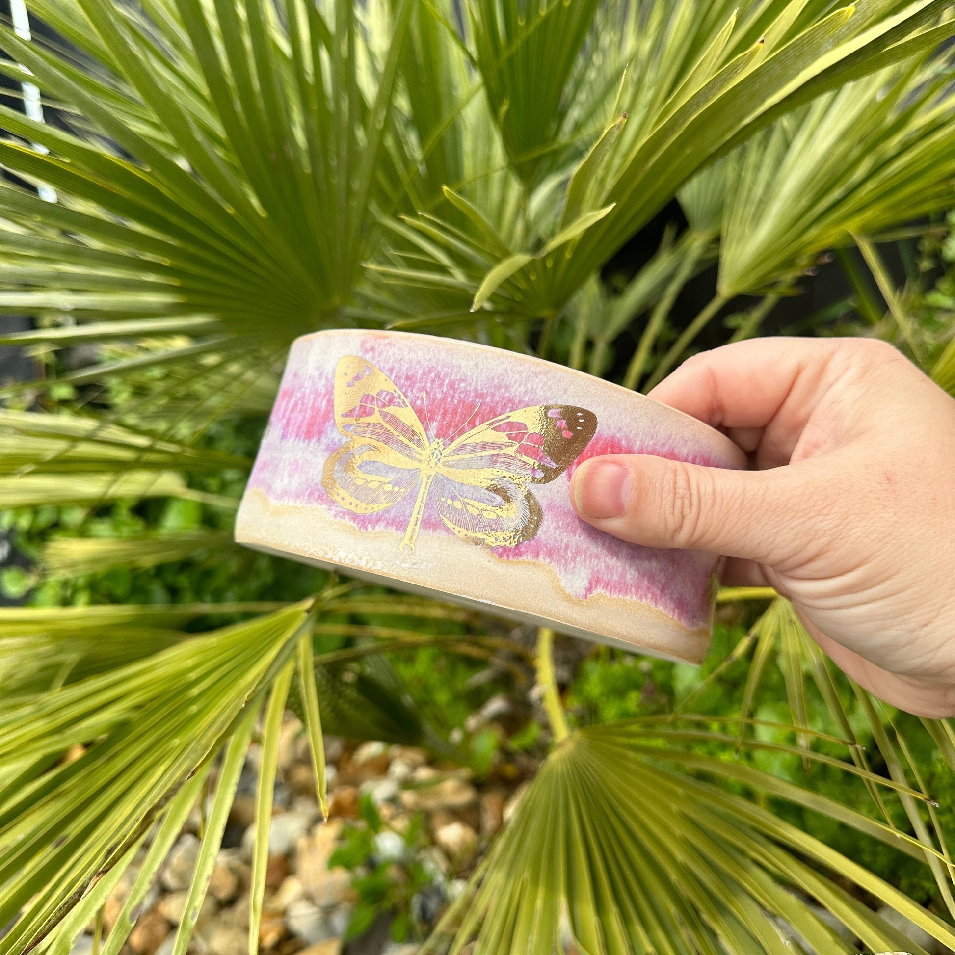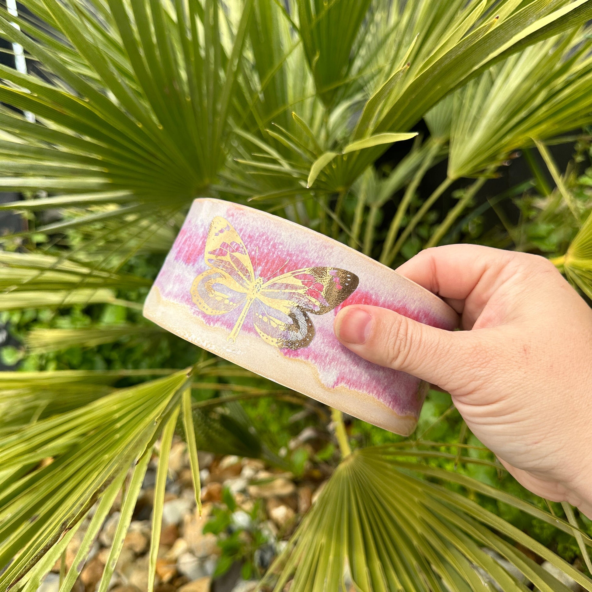 This handmade ceramic dog/pet bowl is pink with a real gold butterflies.