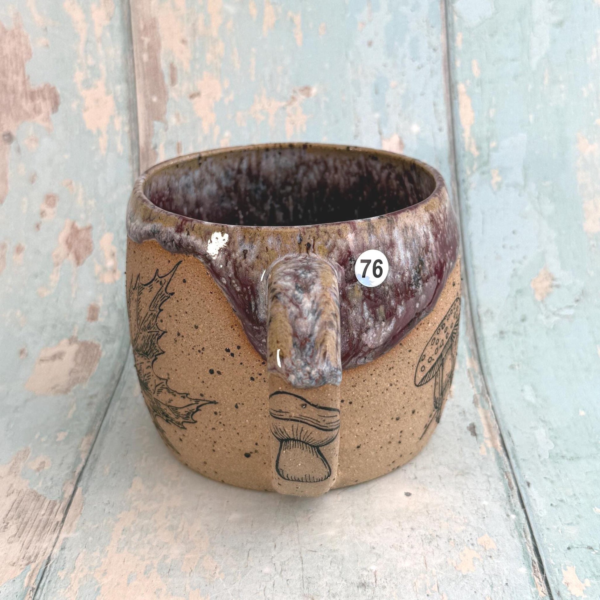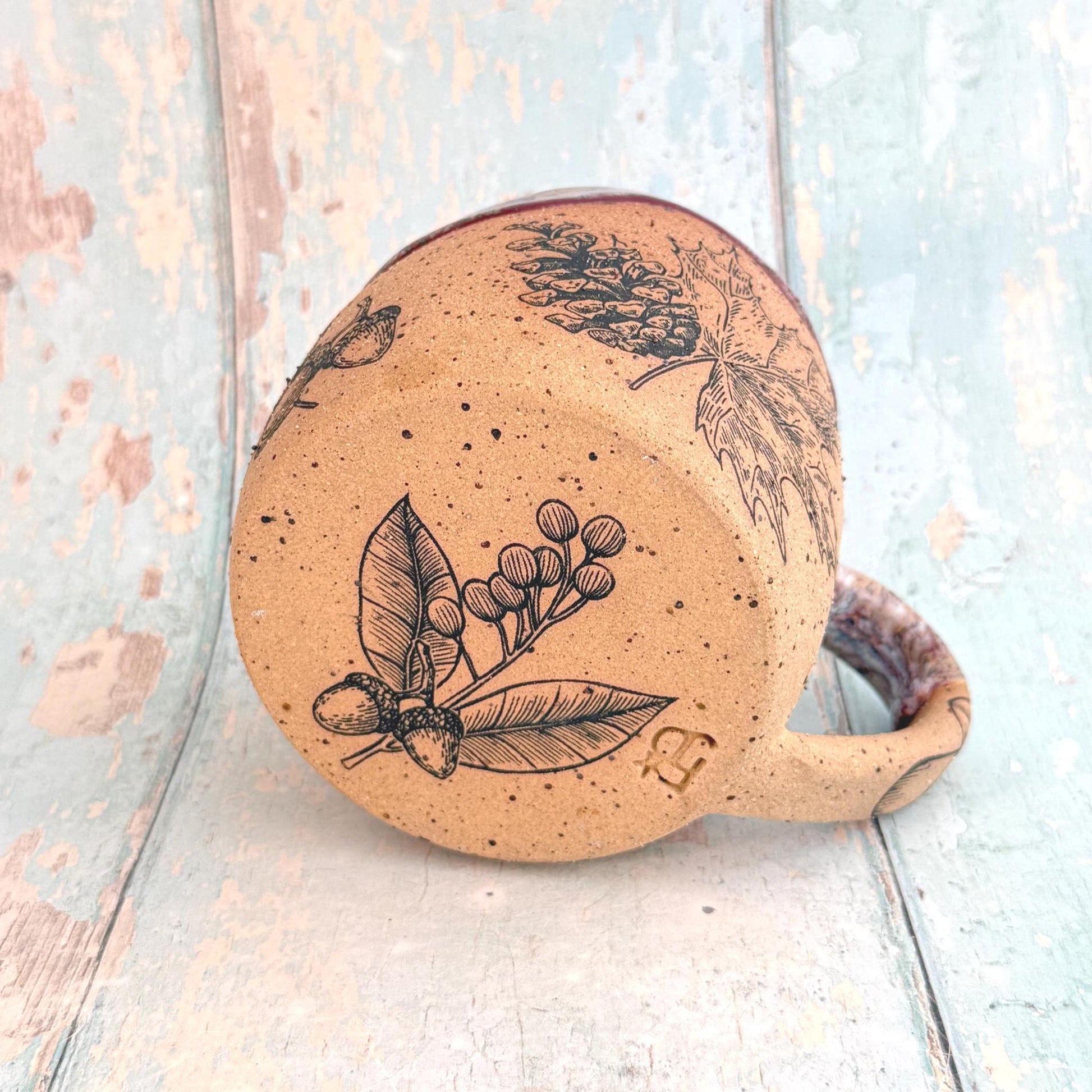 This handmade mug is made with a buff speckled stoneware clay with autumn leaves and plants, and an aubergine eggplant purple coloured glaze.