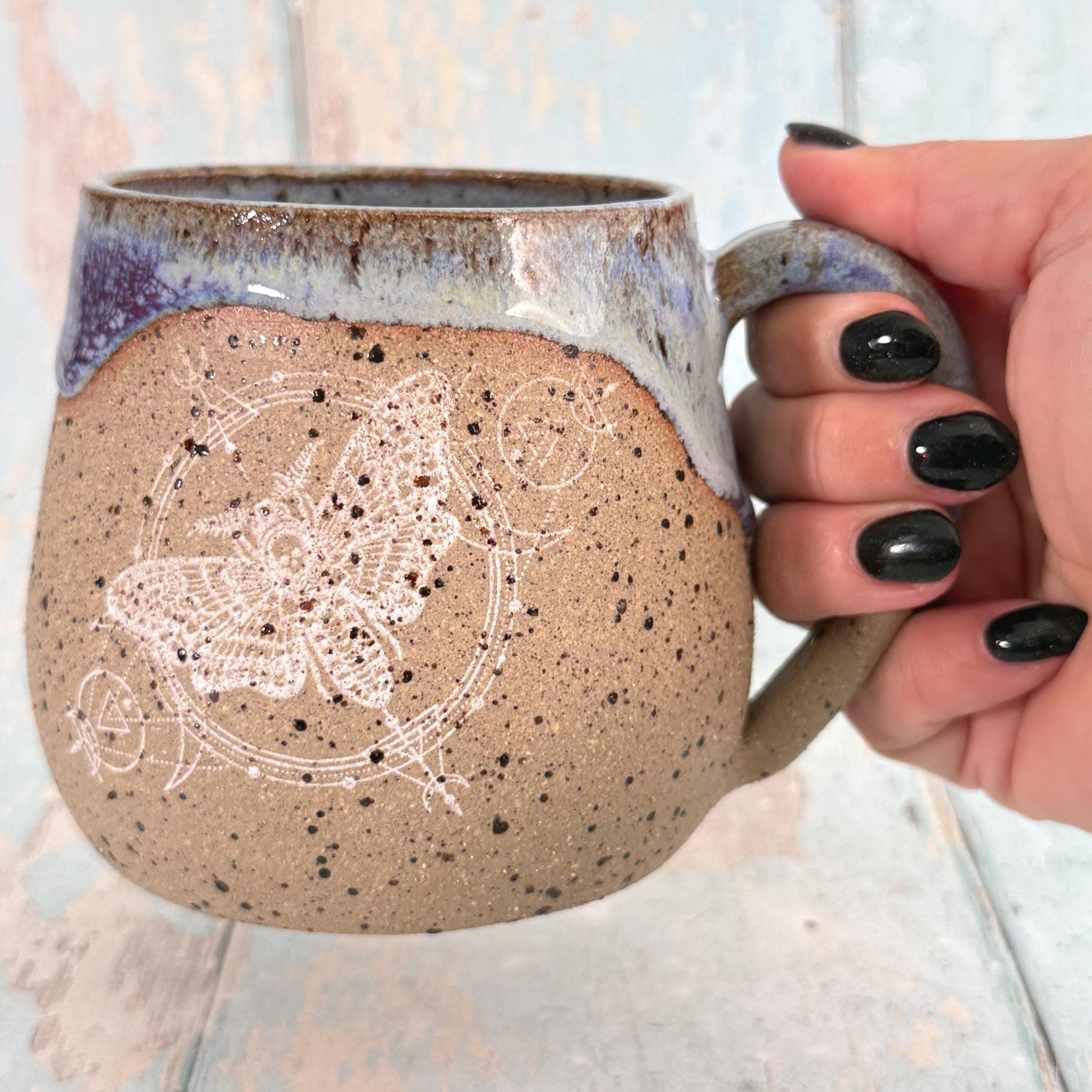This mug has beautiful skull moth illustrations, and made from speckled buff stoneware clay with a purple glaze.