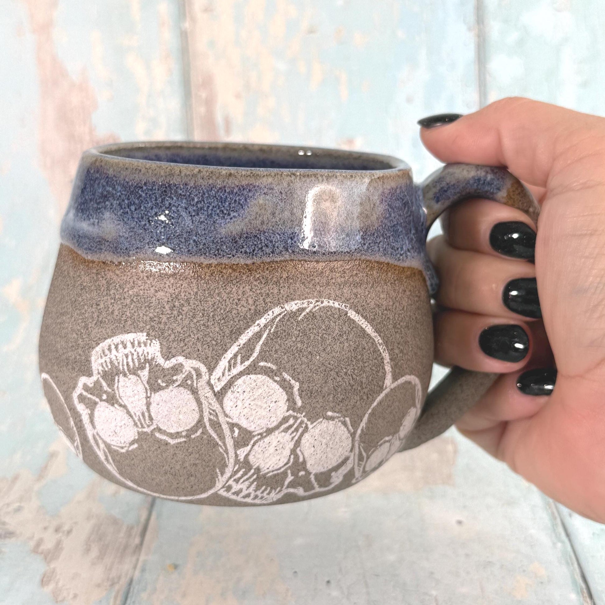This one of a kind skull mug is made from with Grey stoneware clay decorated with a purple glaze, with white skulls and a decorated bottom.