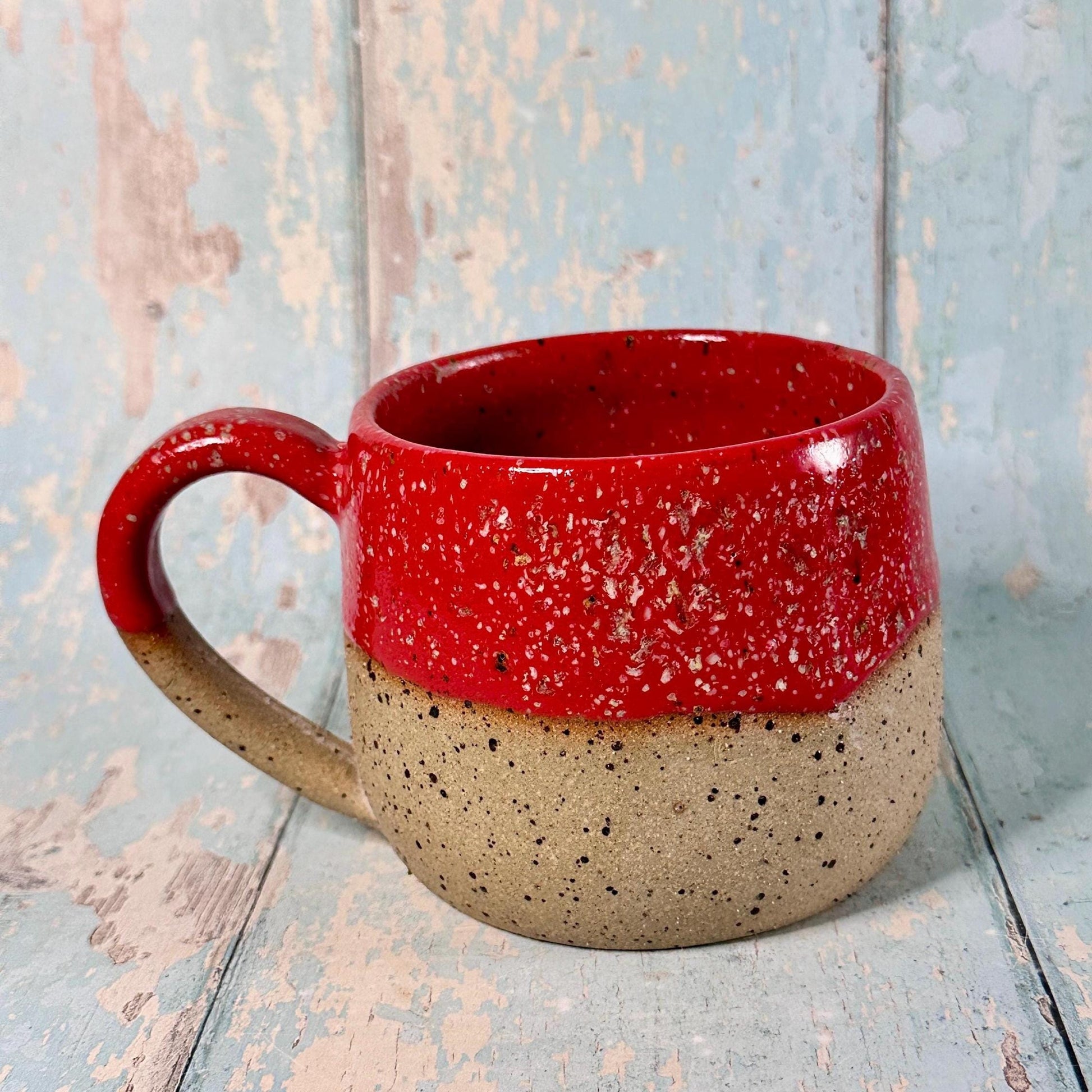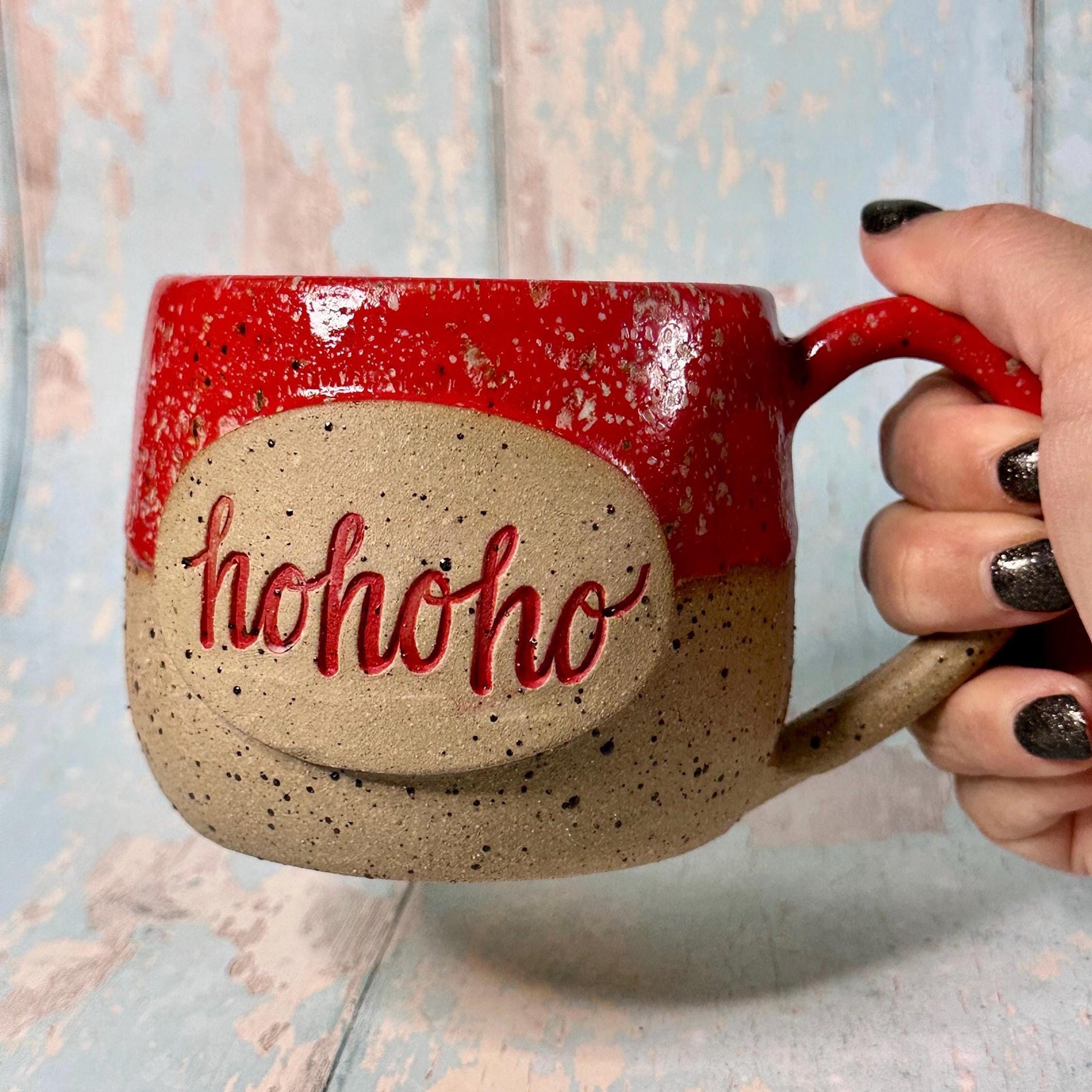 This one of a kind, Christmas Hohoho mug is made from lava fleck stoneware with a red glaze.