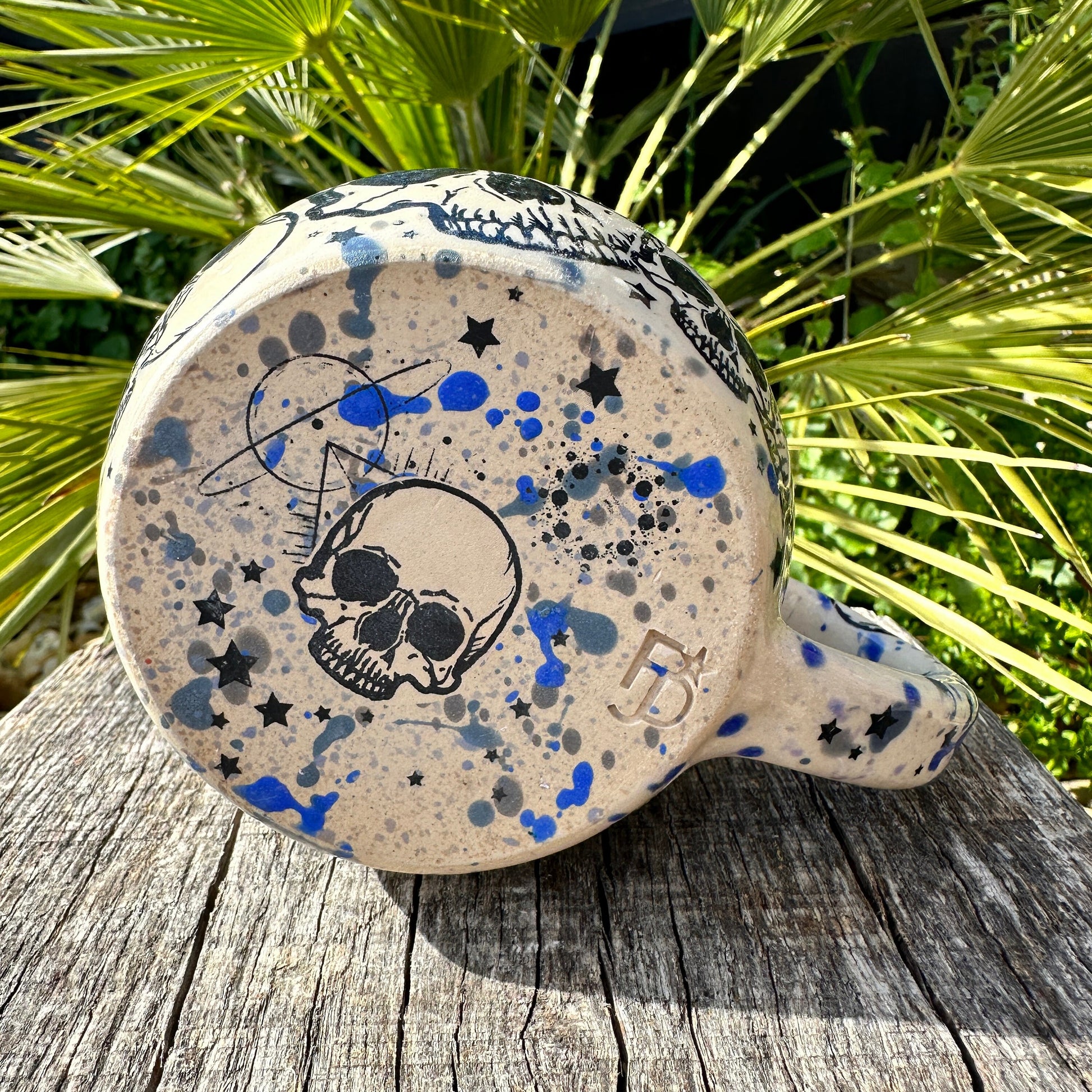 This one of a kind skull and star mug is made from with white stoneware decorated with a blue splatter pattern, with a decorated bottom.