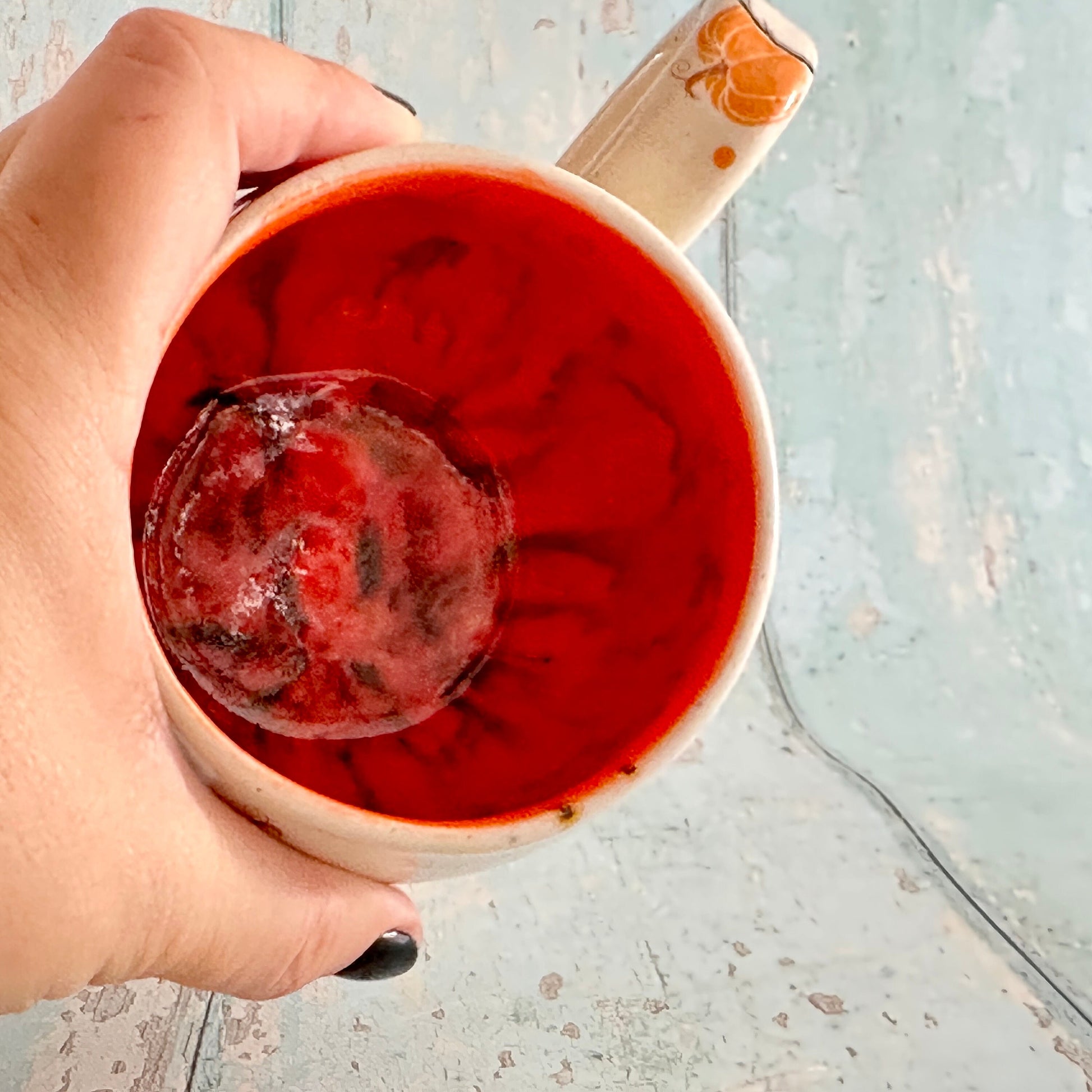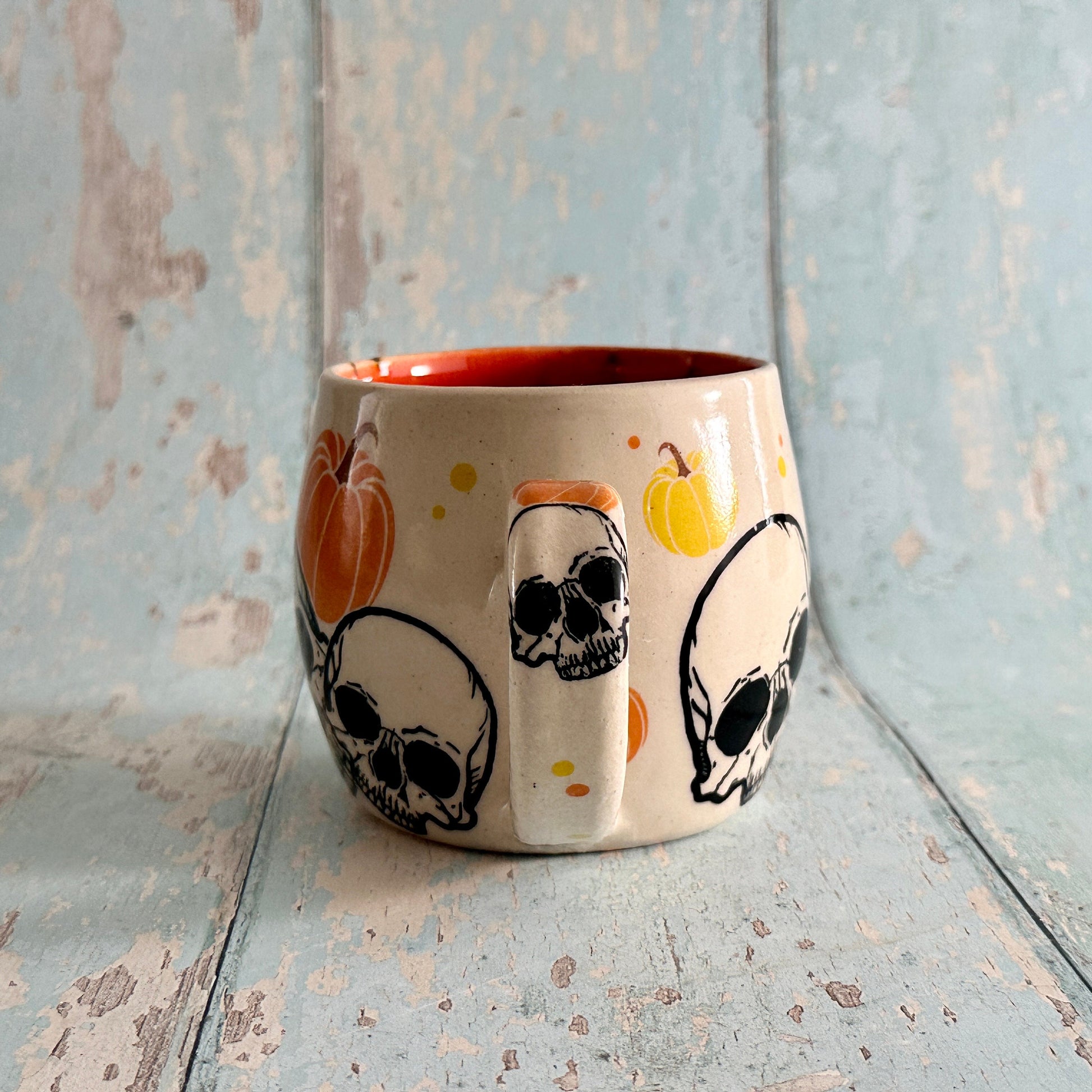 Spooky Halloween Skull and Pumpkin Mug, Orange and Yellow Handmade Ceramic Cup