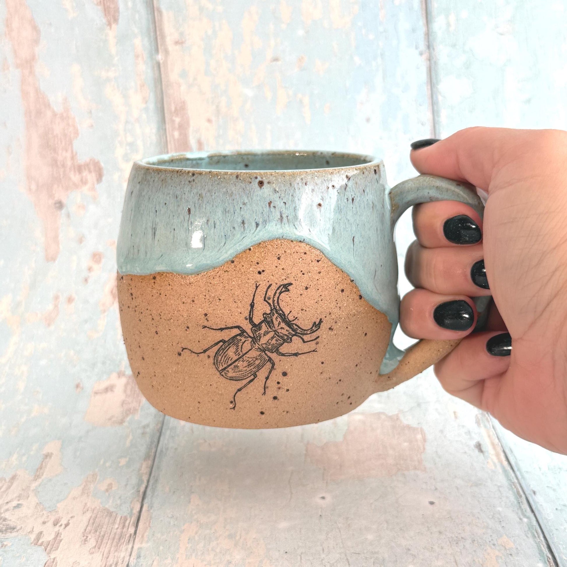 This large beetle mug has turquoise glaze and has black beetles on raw clay.