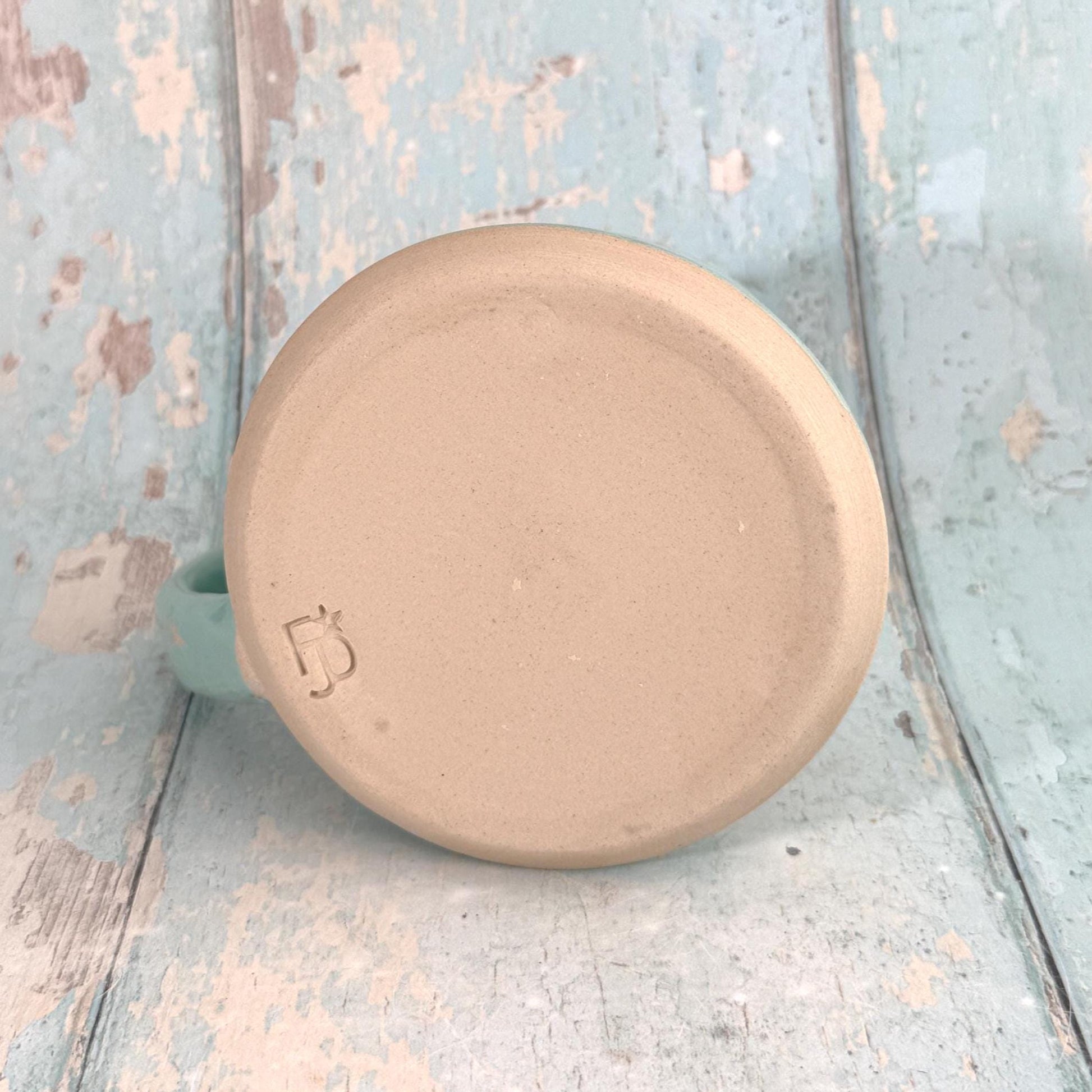 This large handmade aqua turquoise star and moon mug is made with white stoneware clay and a glossy glaze.