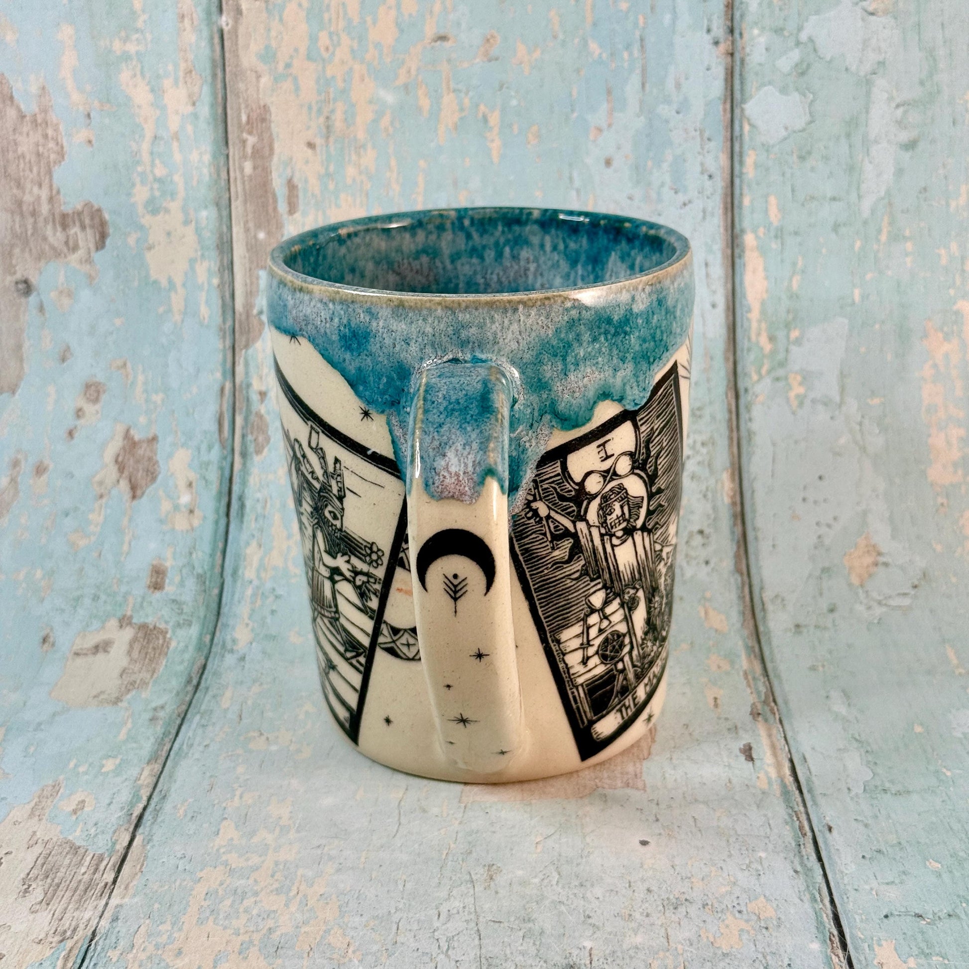 A handmade mug with Tarot cards and snakes, with a turquoise glaze.